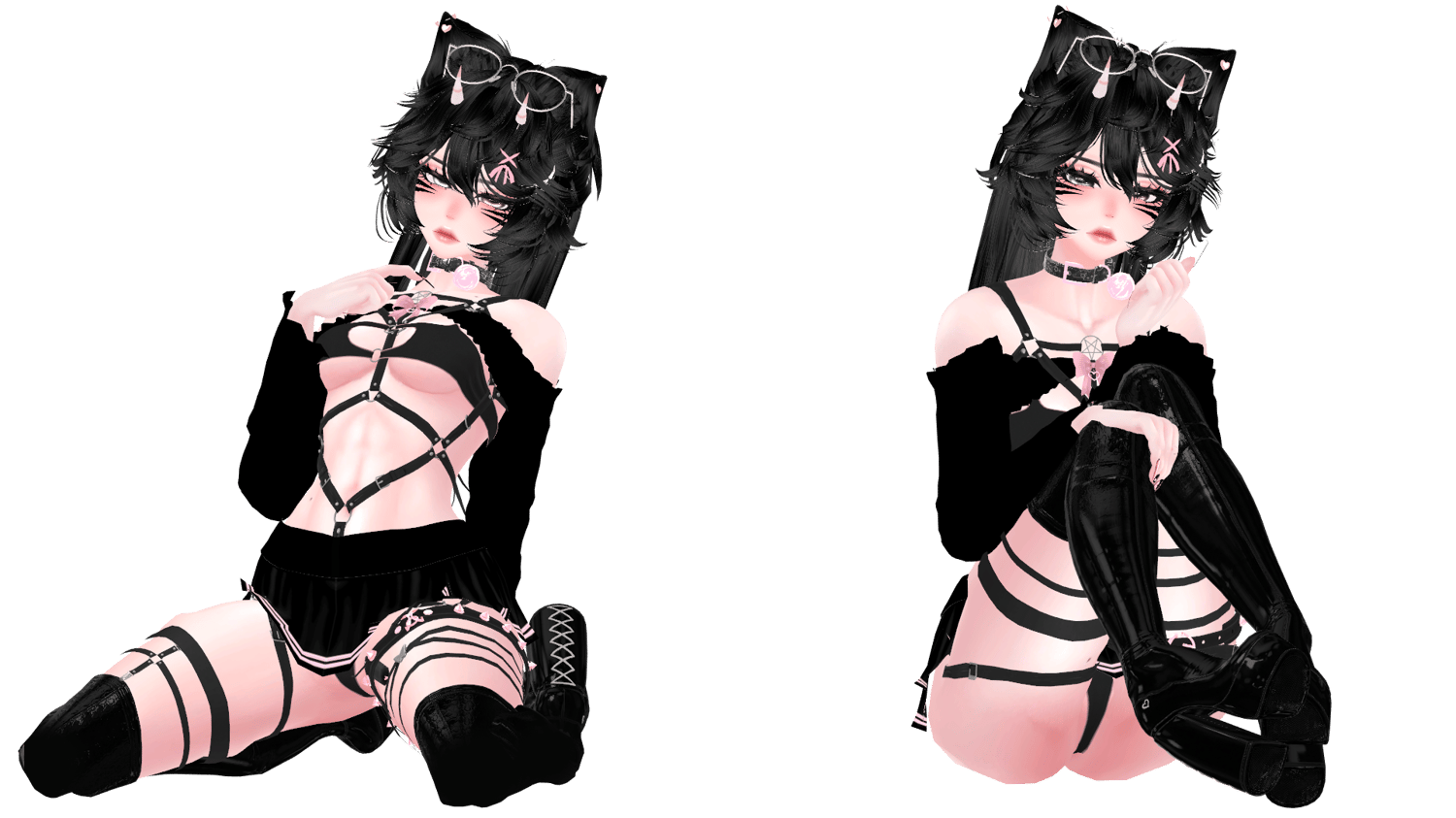 ୨ৎ Accessories: Glasses, belly piercing, collar, harness, pearl waist, 2 thigh garters, hair clips, rings, ankle yarn kitty, mouth yarn heart ball,