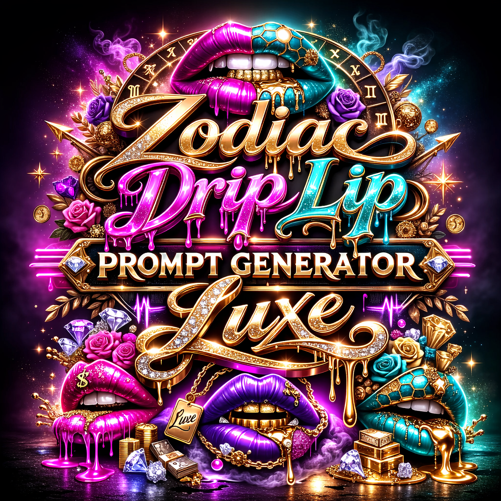 The Zodiac Drip Lip Prompt Generator Luxe™ is a high-end AI prompt system designed to create hyper-luxury, jewel-encrusted, dripping gloss lip artwork inspired by zodiac energy, metallic grills, gemstones, and celestial glam.