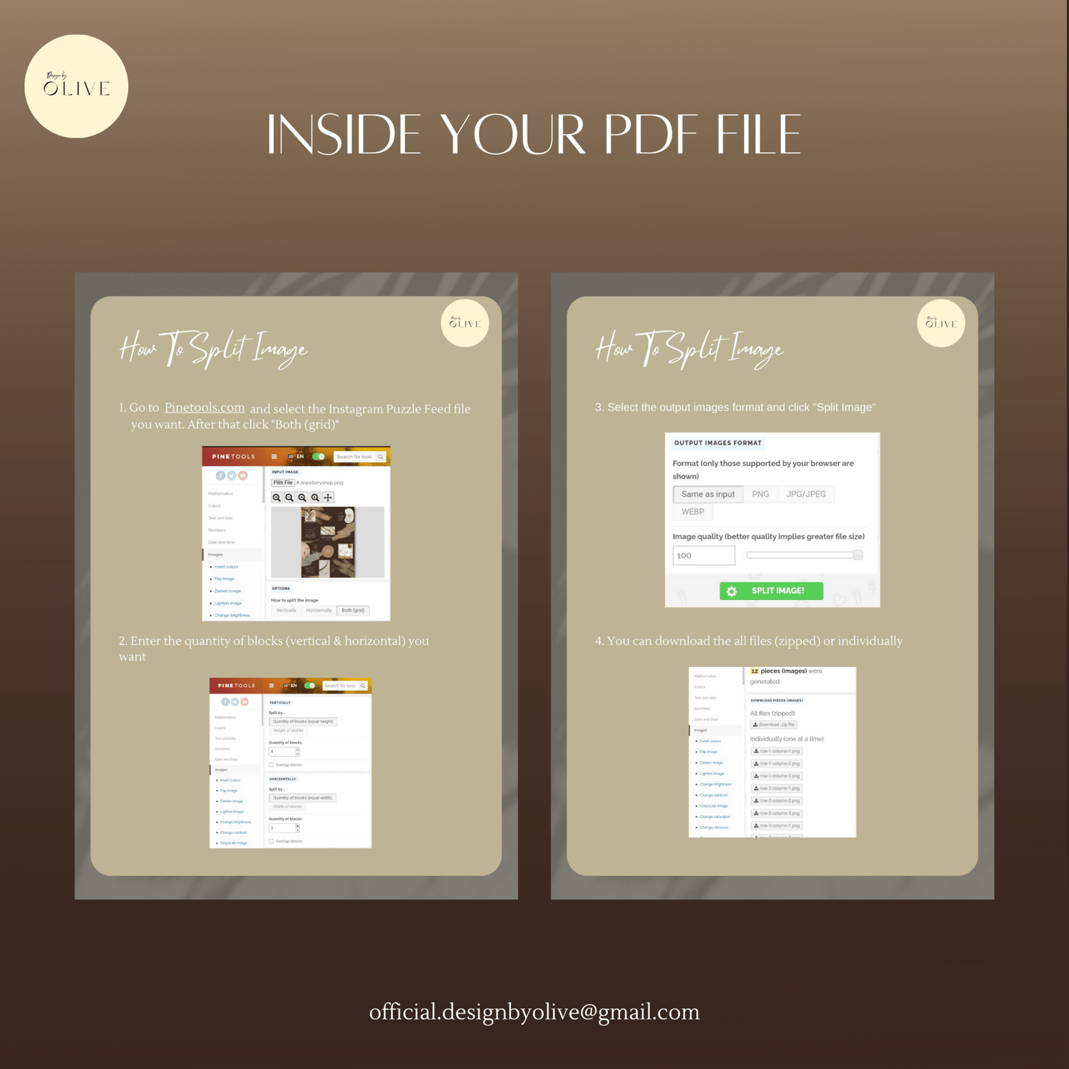 You will get a PDF file containing editable Canva links for 12 Jewelry - Elegant Instagram Puzzle Feeds, including guide to split image