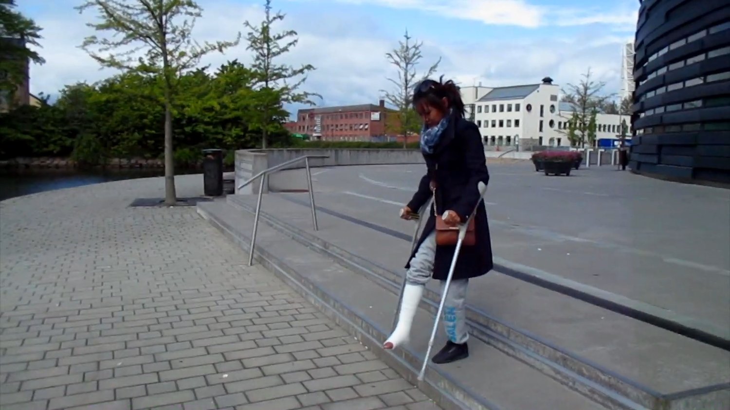 This clip start with Bunny have her white SLC up on a wal like a ballerina.She take her crutches and start going down to the channel edge.In the second part of this clip we see Bunny crutching in to a Mall.