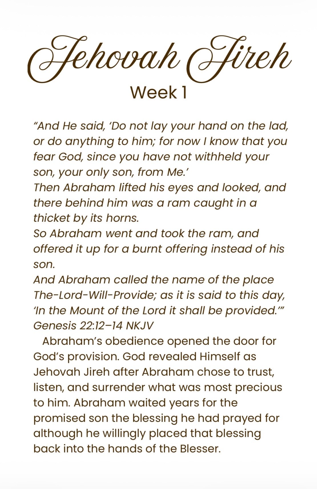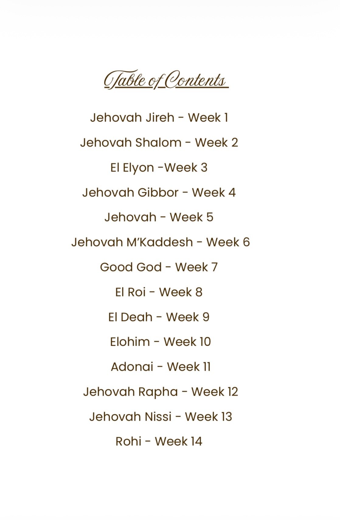 This 14 week devotional invites you into a deeper, more intimate journey with God by learning and praying one powerful name of God each day. Designed for worshipers, intercessors, and anyone longing for growth! This devotional helps you experience the heart of God through His character, His attributes, and His promises.