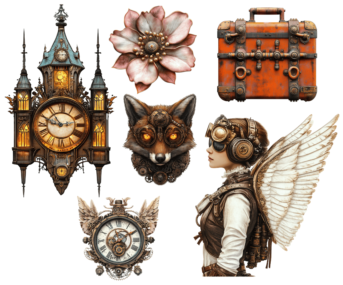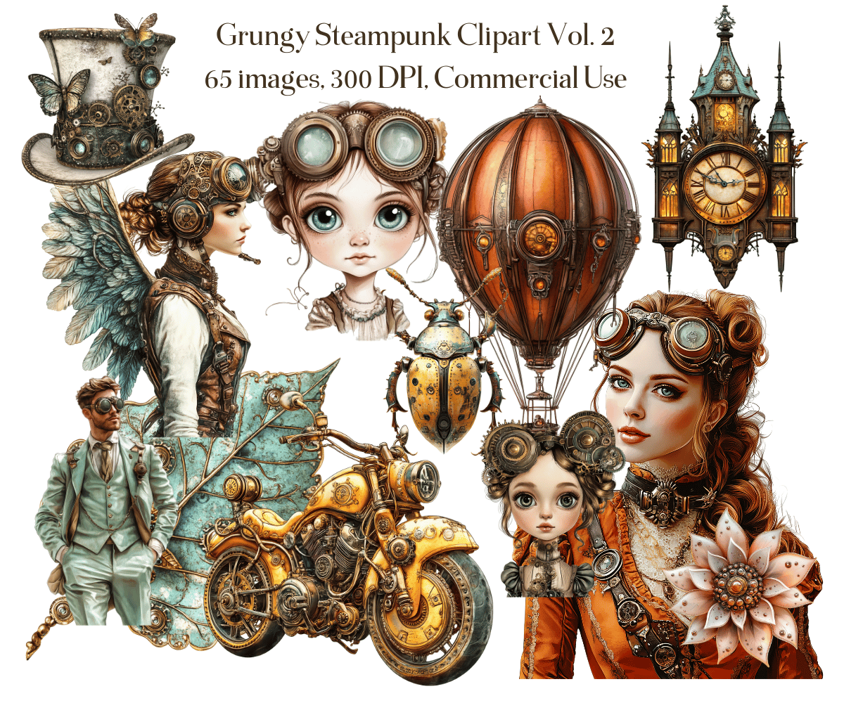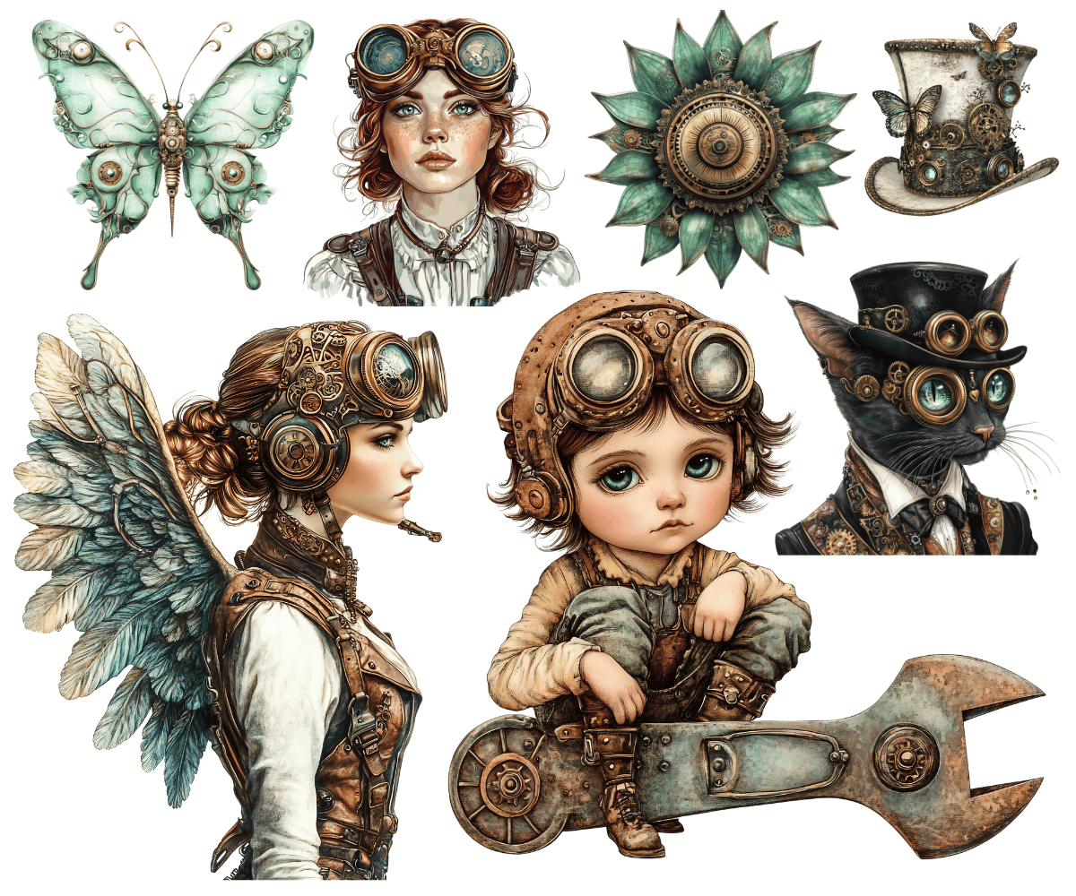 Elevate your crafting projects with our gorgeous Grungy Steampunk Clipart Volume #2 - 65 PNGs available for commercial use. Perfect for instant download and sublimation design. Clipart includes elegantly styled elements suitable for crafting projects in gorgeous tones. Ideal for digital art, printable clipart, and crafting, this set is a must-have for creating charming arts and crafts designs. In fact, cut them out and place them on your planners to make for an extra special gift for an organizer.