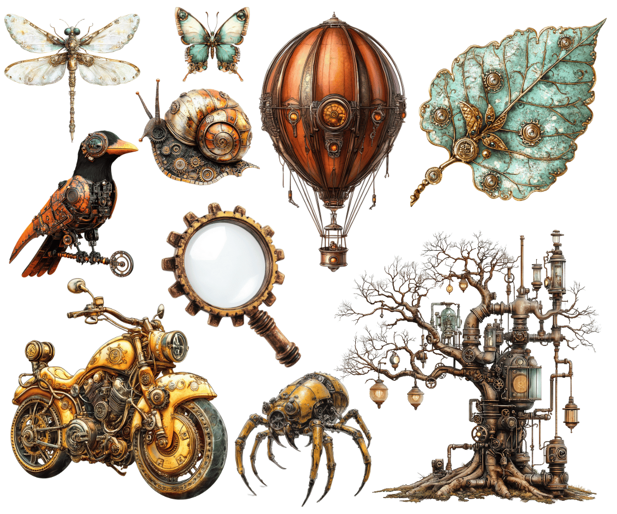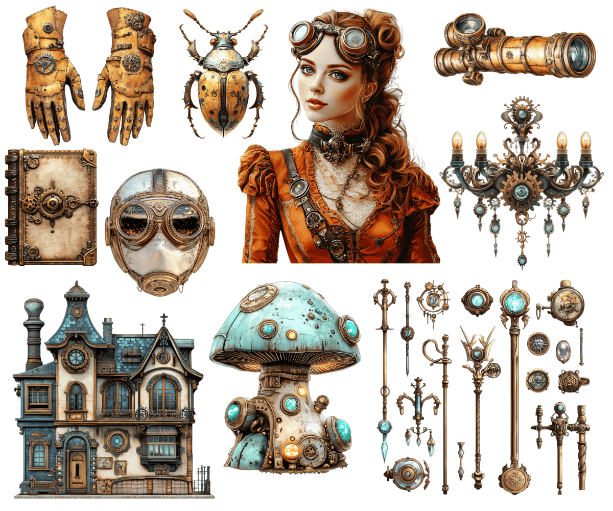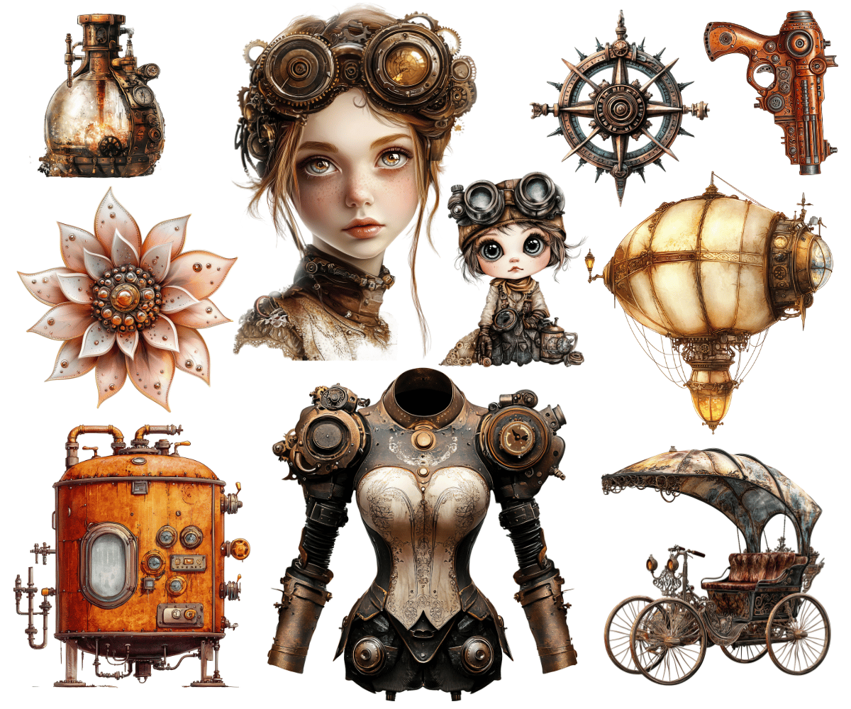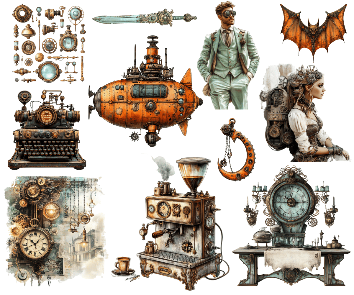Elevate your crafting projects with our gorgeous Grungy Steampunk Clipart Volume #2 - 65 PNGs available for commercial use. Perfect for instant download and sublimation design. Clipart includes elegantly styled elements suitable for crafting projects in gorgeous tones. Ideal for digital art, printable clipart, and crafting, this set is a must-have for creating charming arts and crafts designs. In fact, cut them out and place them on your planners to make for an extra special gift for an organizer.