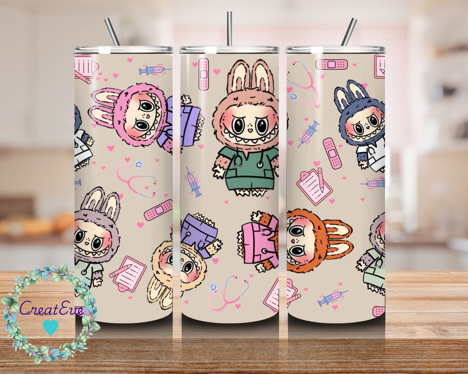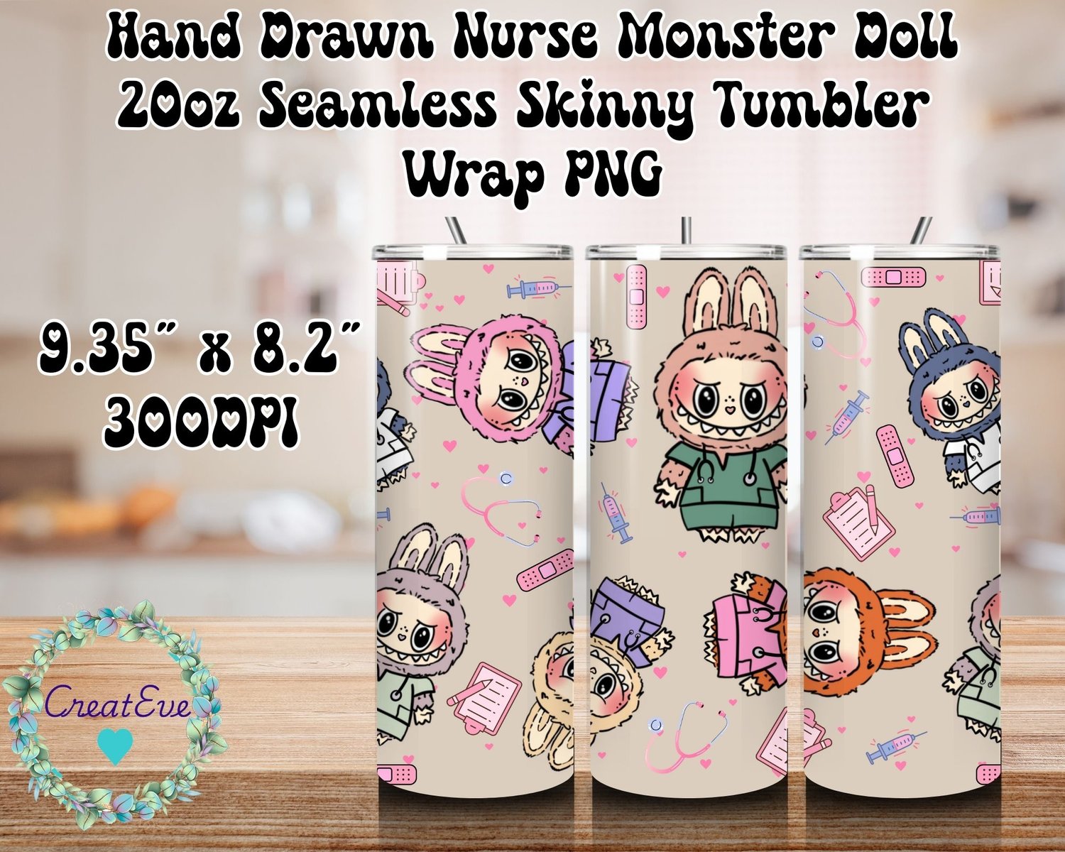 Hand Drawn Nurse Monster Doll Seamless 20oz Skinny Tumbler PNG
