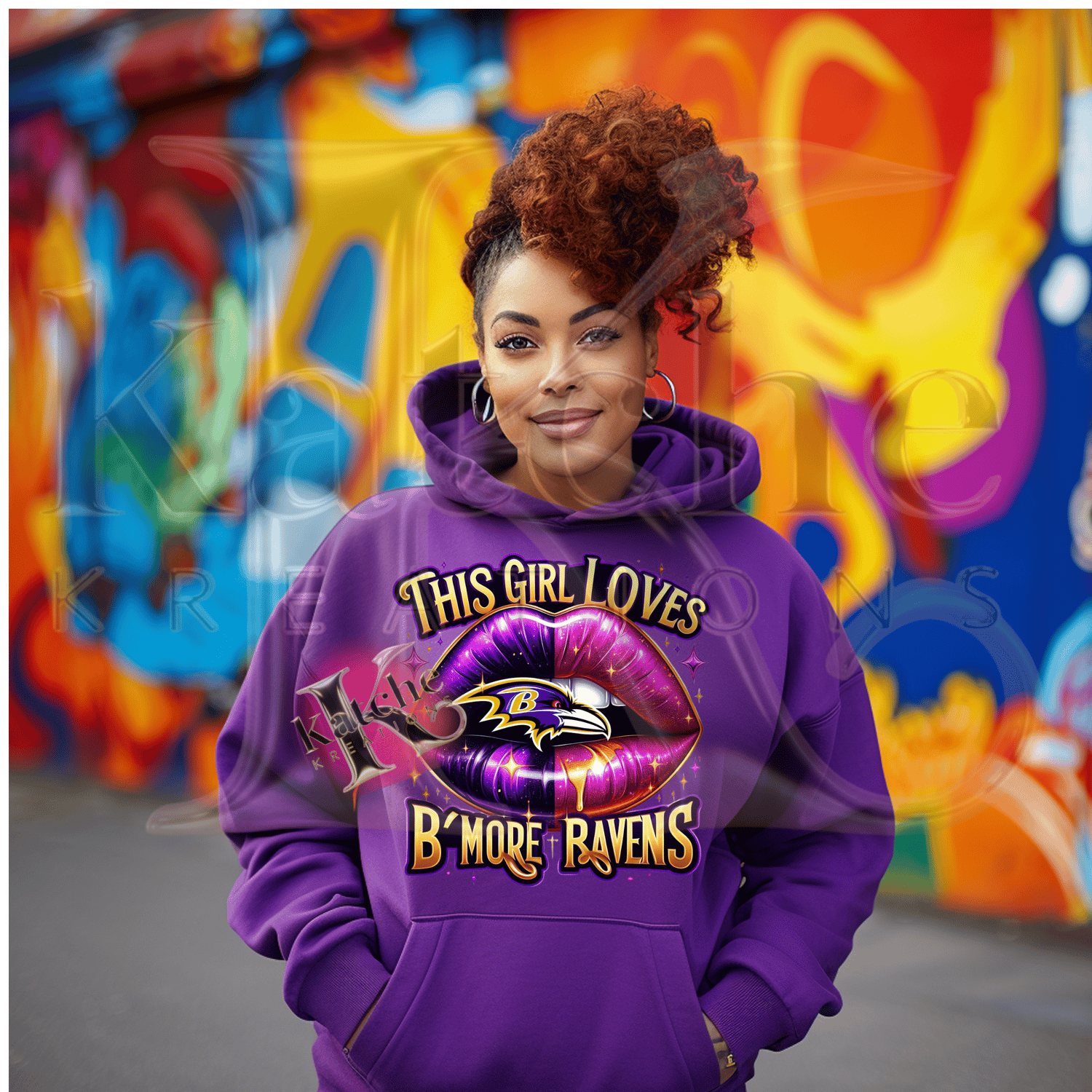 Show your Ravens pride with a sassy and dazzling twist! This eye-catching design features luscious lips in striking purple and gold tones, complete with the Ravens logo and a sparkling "This Girl Loves B’More Ravens" slogan. Perfect for bold and creative projects that make a statement!