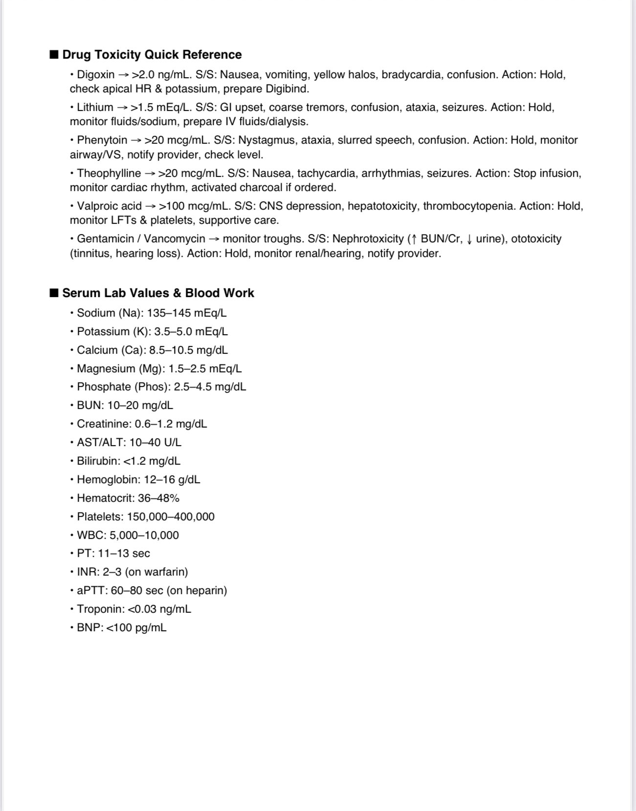 - Serum lab values, toxicity levels, and first interventions