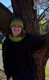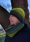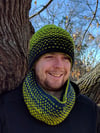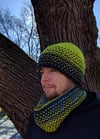 Small version of the cowl requires approximately 200 yards, or 2 contrasting skeins of worsted weight yarn, and can be sized to size desired.