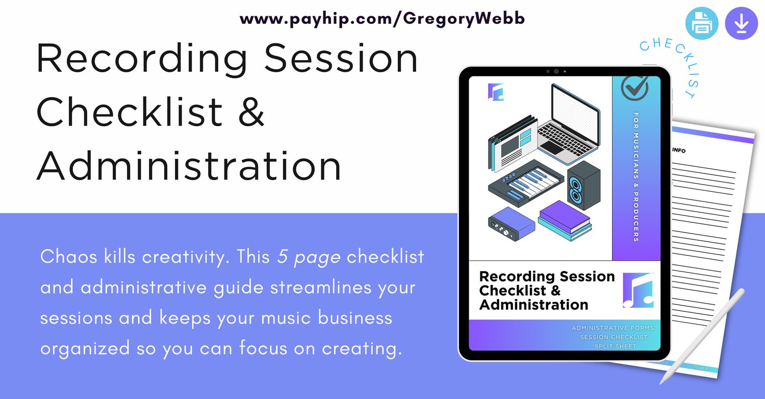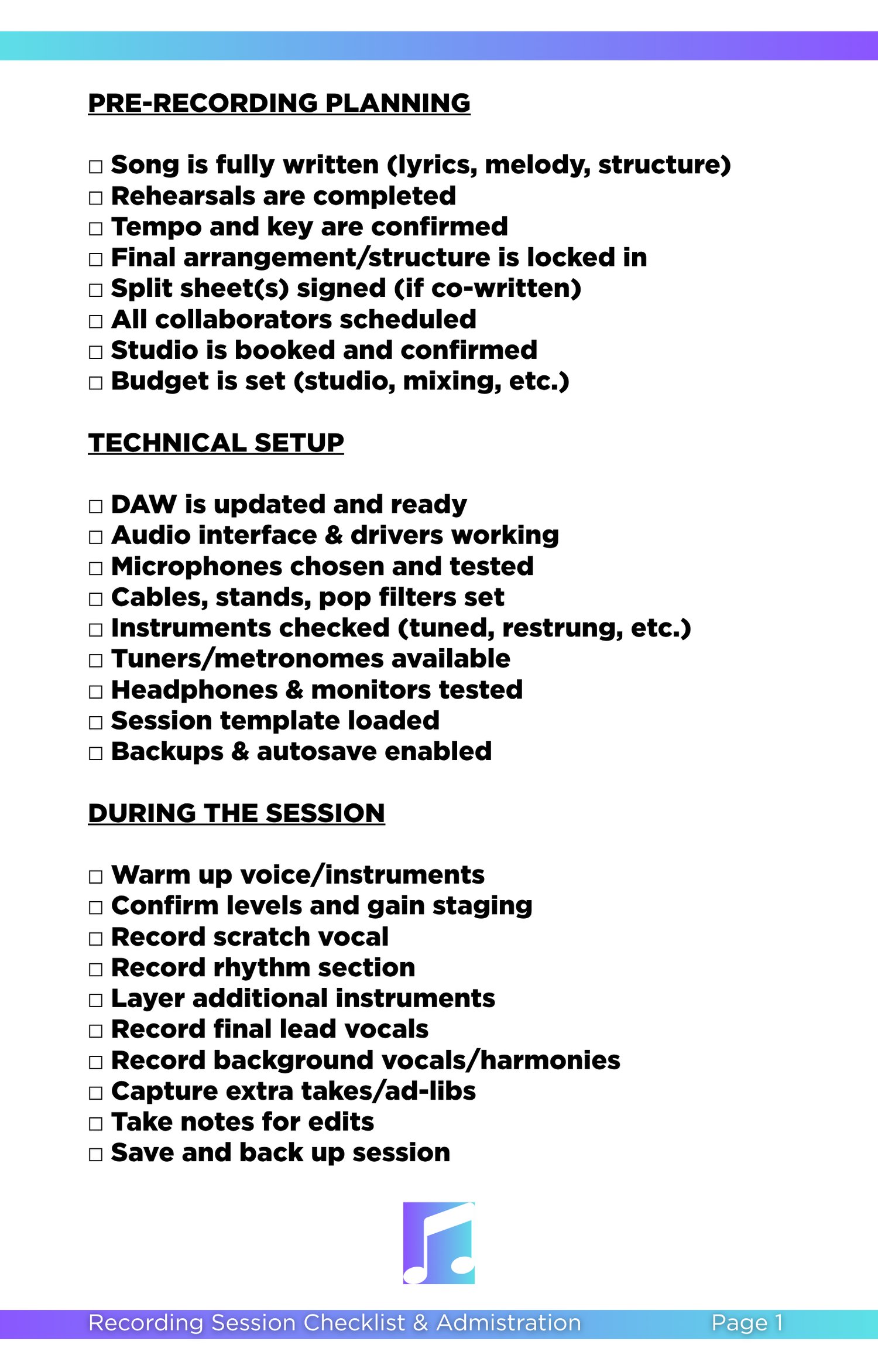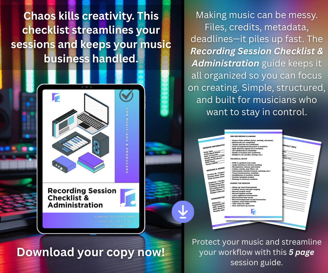 🗂️ Chaos kills creativity. This checklist streamlines your sessions and keeps your music business handled. From files to credits and metadata, the Recording Session Checklist & Administration guide keeps it all organized so you can focus on creating. Includes Session Checklist, Split Sheet, and Admin Forms across 5 pages.