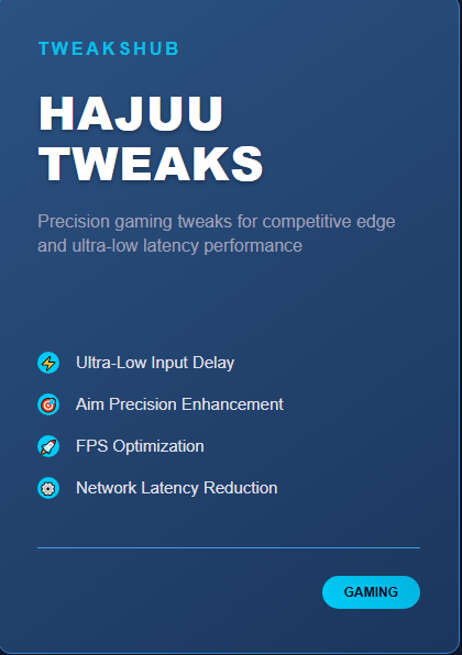 Hajuu Tweaks is the ultimate optimization tool, specifically designed to elevate your gaming experience by increasing FPS, lowering ping, and reducing input delay.