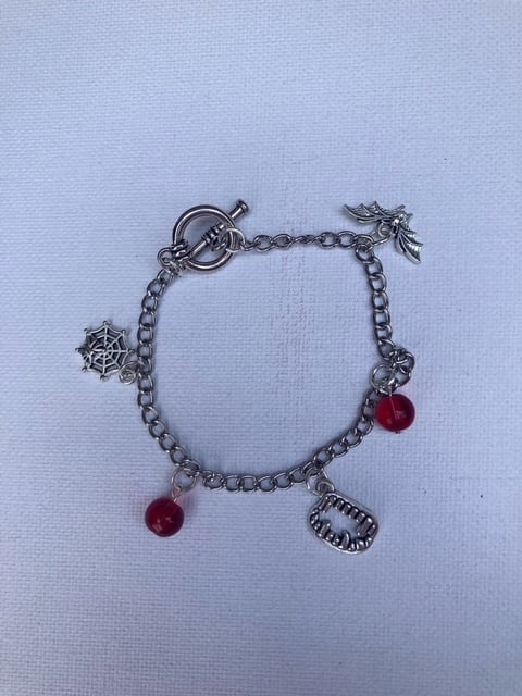 This gothic-inspired charm bracelet features two red glass beads and three charms (a spiderweb, a bat, and vampire fangs).