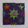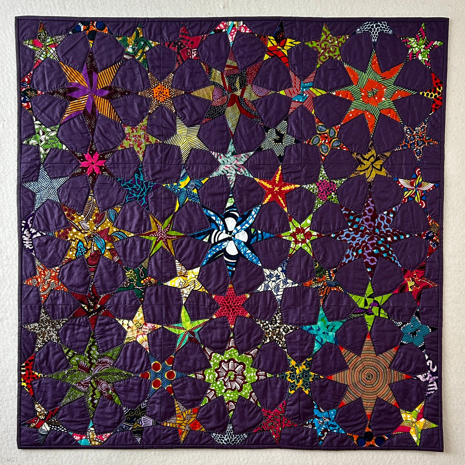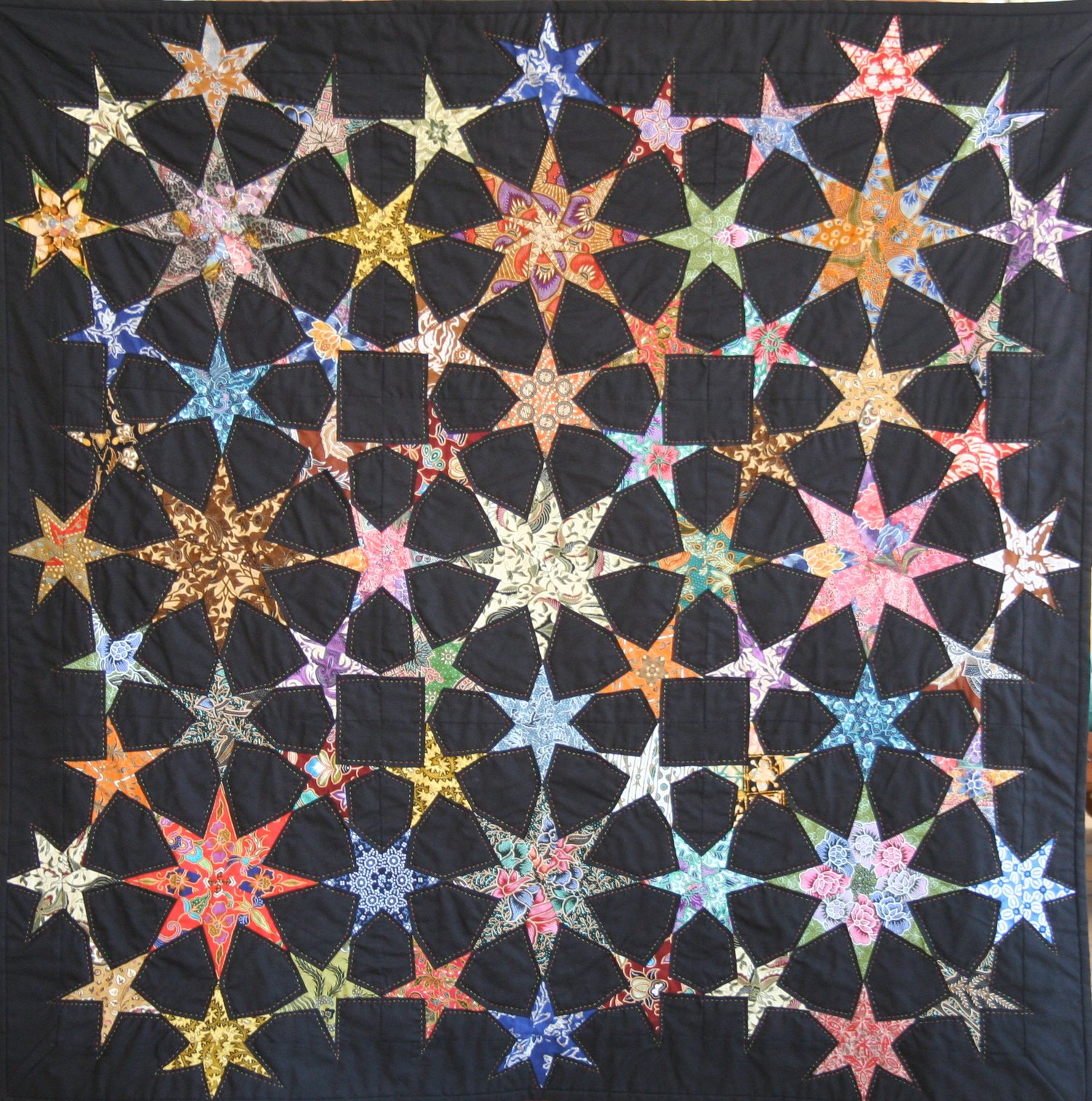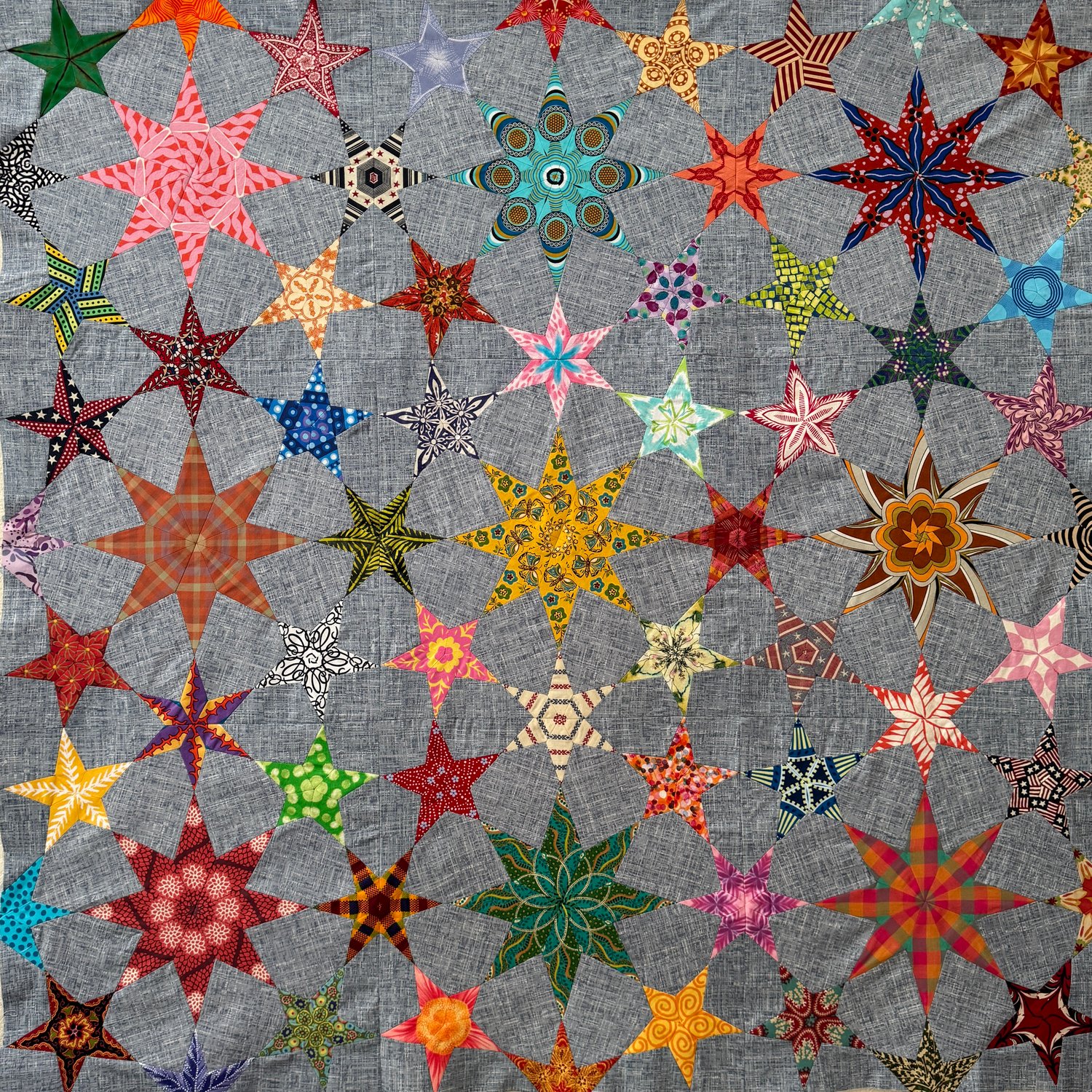 Star quilt, a design from 2019, based on a photo in the Quilters Guild magazine from 2002, featuring an 8-point star, a 6-point star, and a 5-point star.