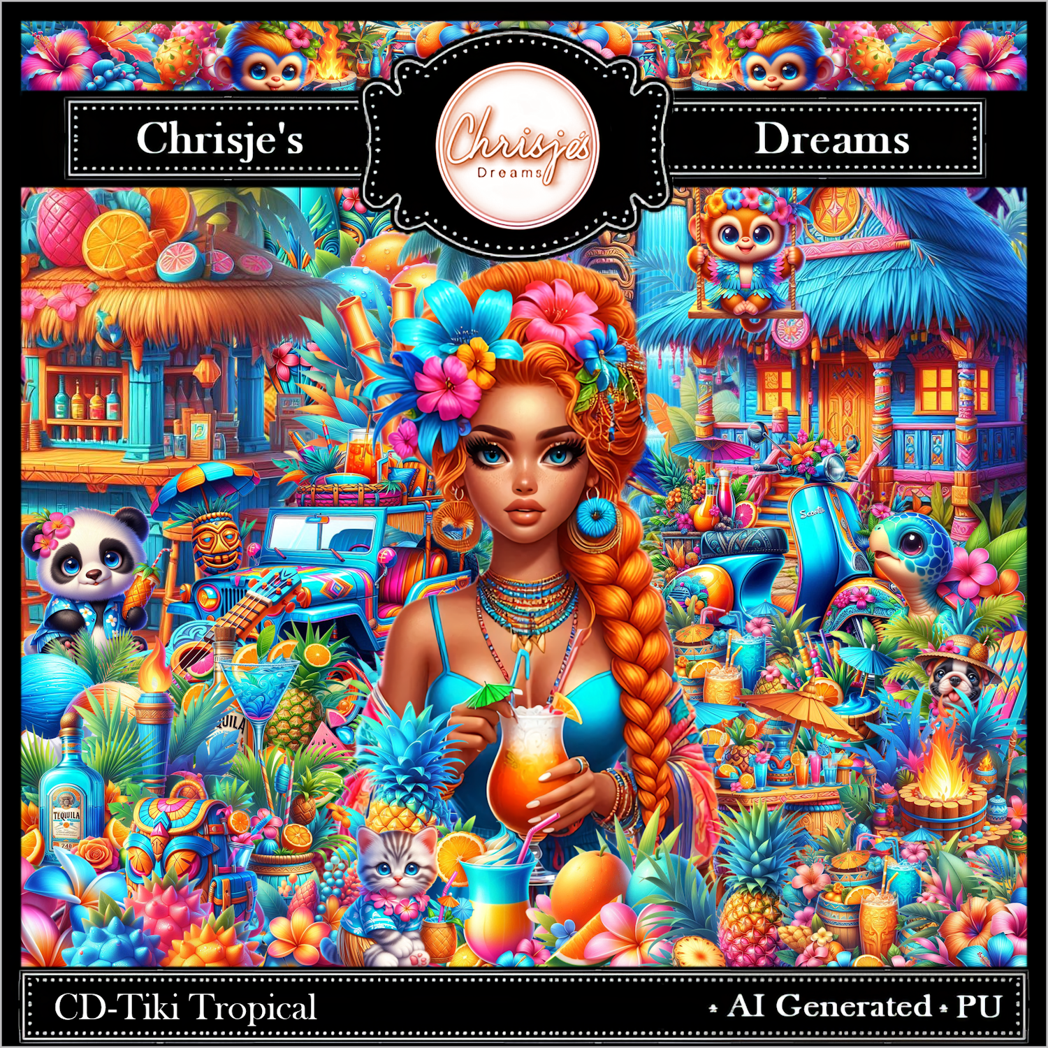 Tiki Tropical is a ☀️🍹Summer☀️🍹 themed kit which contains 216 elements,14 frames, 20 papers and 4 beautiful AI generated png tubes by Chrisje's Dreams.