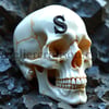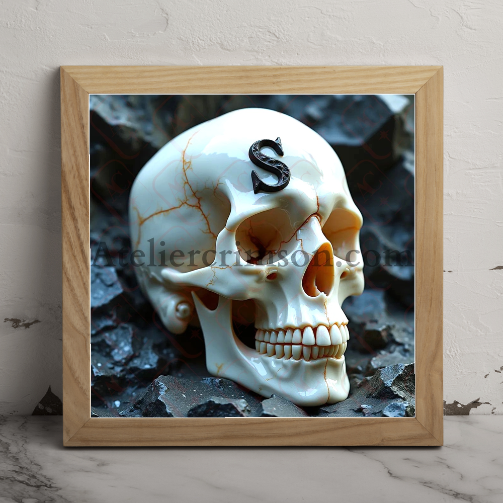 The letter S skull obsidian marble deeply engraved character on the forehead of a white marble skull. The character, filled with dark obsidian, contrasts sharply against the pale skull. Set against a black crystalline background, the skull and character dominate the image.