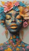 Her closed eyes and calm expression symbolize peace, healing, inner royalty, and ancestral strength.