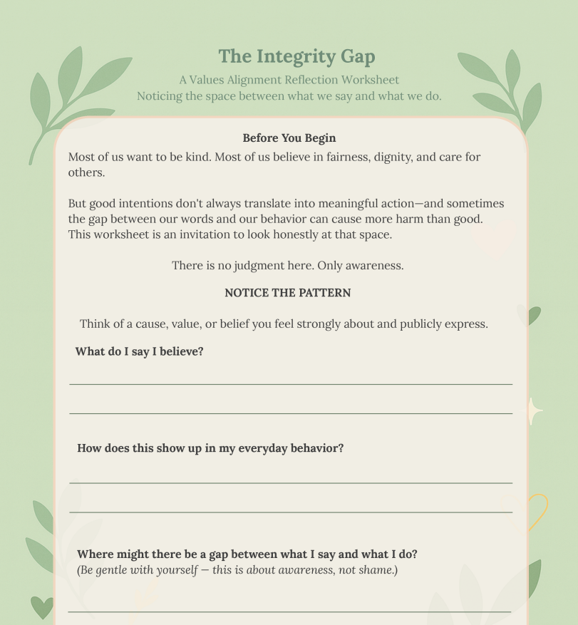 The Integrity Gap is a guided reflection worksheet designed to help you honestly examine where your expressed values and your everyday behavior might not yet be aligned.
