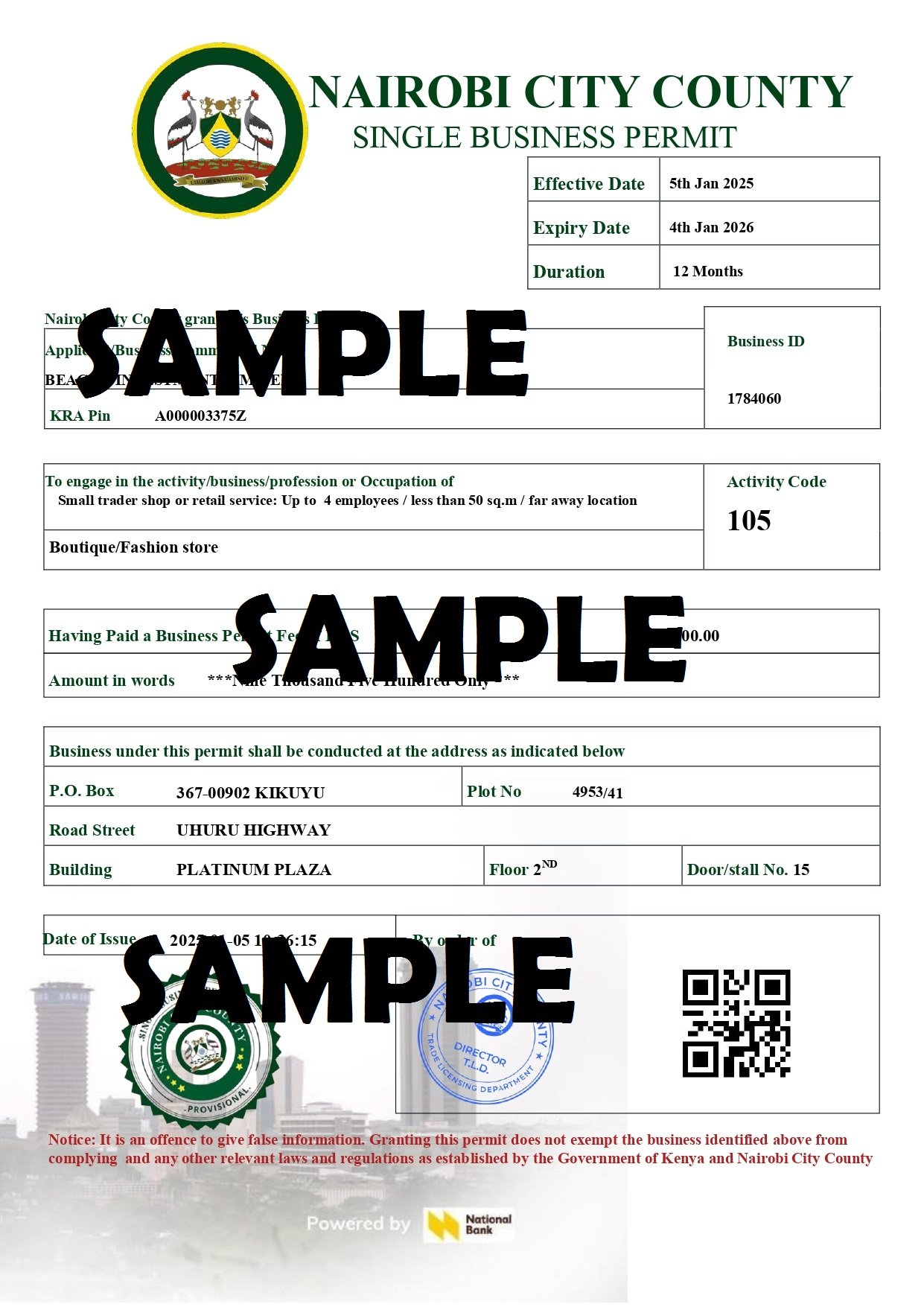 Fully editable Kenya Nairobi County Business Permit in doc (word) format. Just open the document with word and you are good to go. I am always available for any further help.