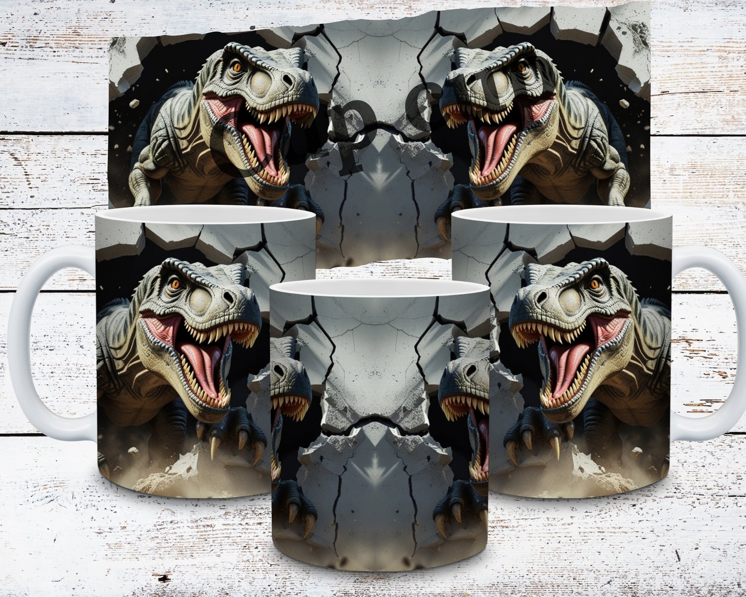 Roaring 3D Dinosaur Hole in a Wall Mug Wrap Template for 11oz and 15oz Mugs, PNG Sublimation Design Instant Digital Download
