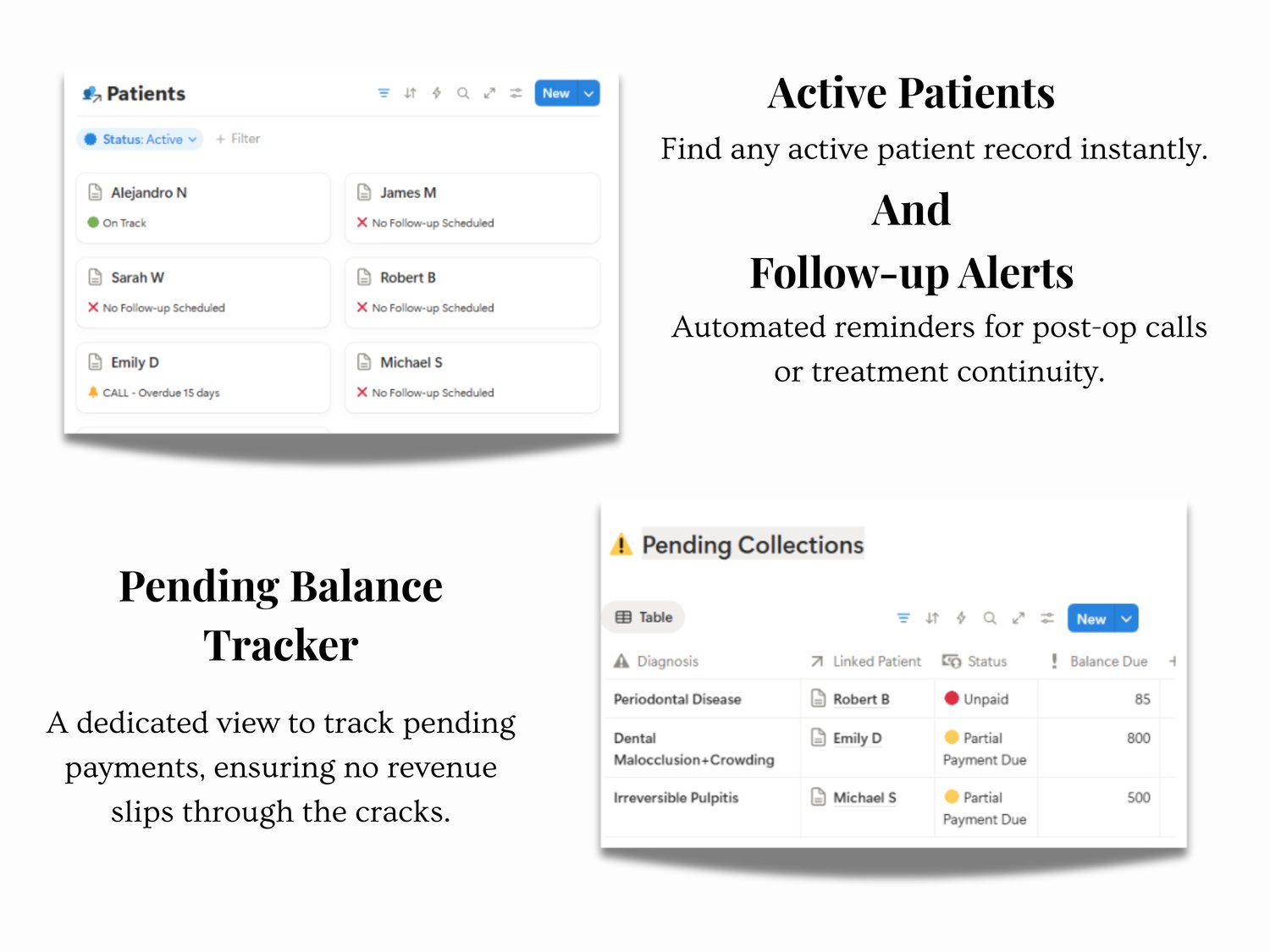 - Patient Records: Manage detailed patient histories, treatment plans, contact information, and payment status in dedicated, easy-to-update cards.