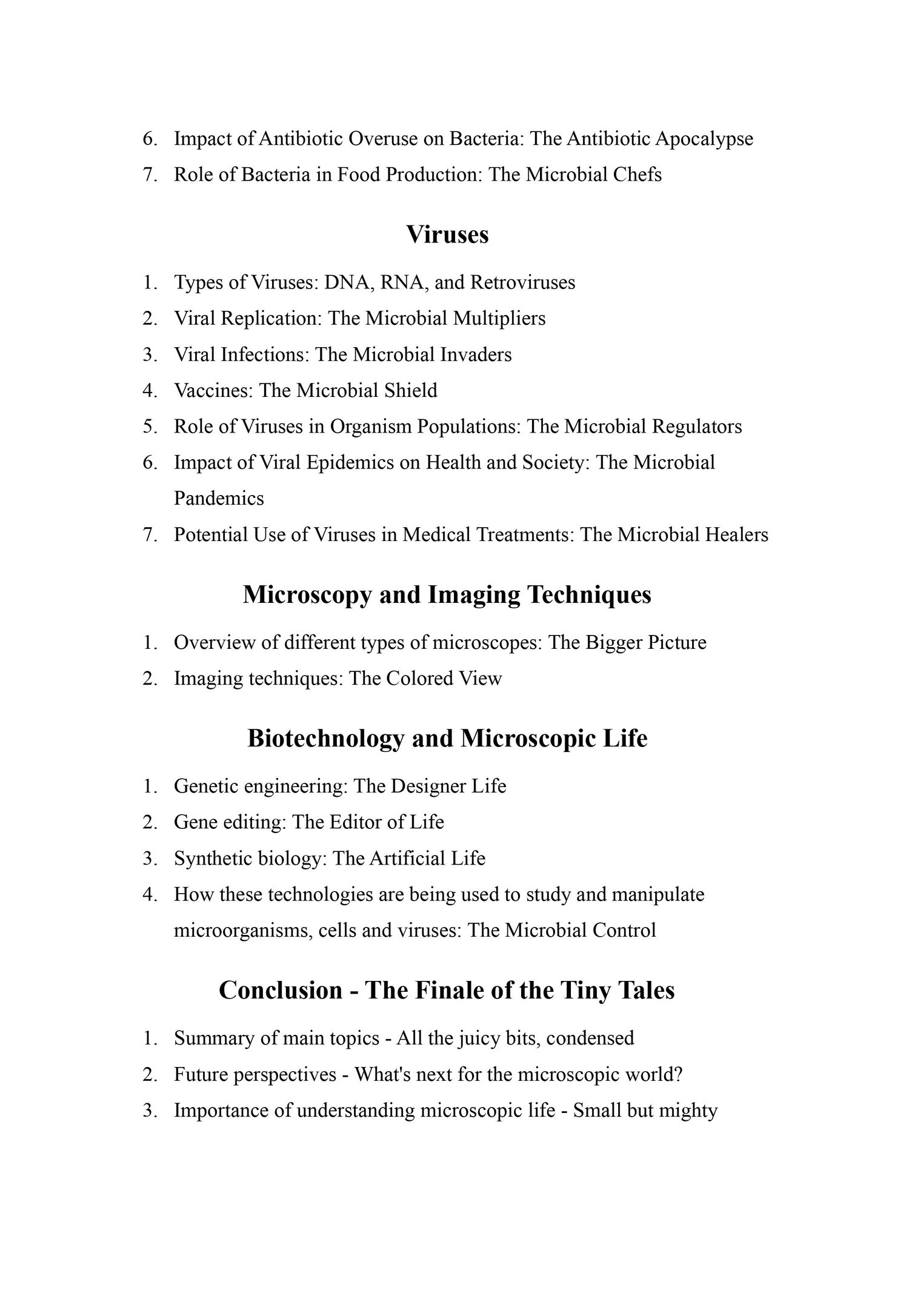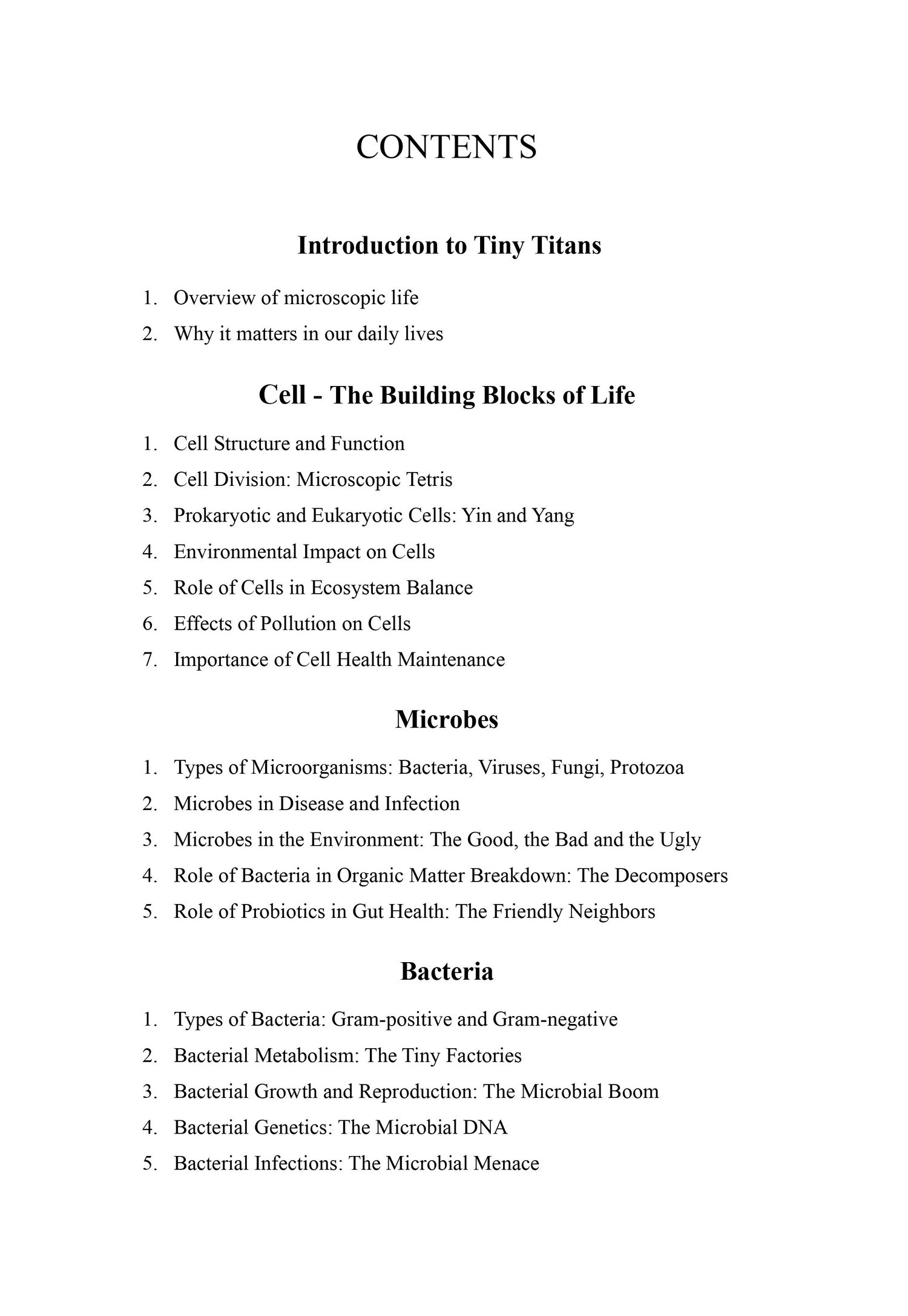 Dive into the fascinating world of microscopic life with "Tiny Titans: The Mighty Microbes That Rule the World." Written in a humorous and engaging style, this book takes you on a journey through the building blocks of life, the different types of microorganisms, and their impact on our daily lives. From the cell structure and function, to the role of bacteria in organic matter breakdown, this book covers it all. Learn about the different types of bacteria, viruses and fungi, and how they affect our health and environment. Discover the impact of antibiotic overuse and the potential use of viruses in medical treatments. Explore the world of microscopy and imaging techniques and the latest biotechnology advancements in genetic engineering, gene editing and synthetic biology. With "Tiny Titans," you'll gain a deeper understanding of the microscopic world and its importance in our lives. This book is a must-read for anyone interested in science, medicine and the environment