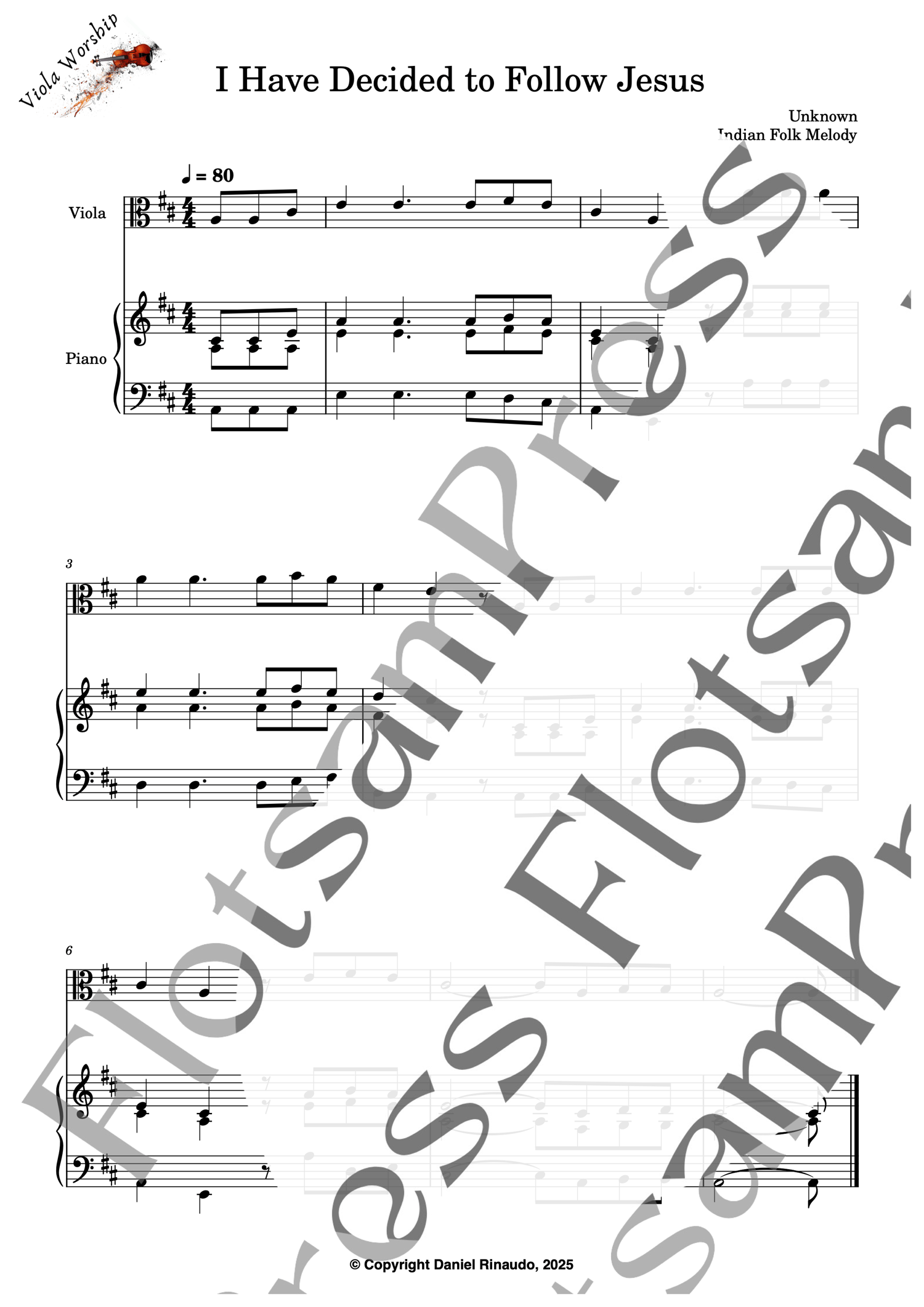 This arrangement of I Have Decided to Follow Jesus is written for beginner to lower-intermediate viola players, with a simple and supportive piano accompaniment. Perfect for church services, lessons, or home practice.