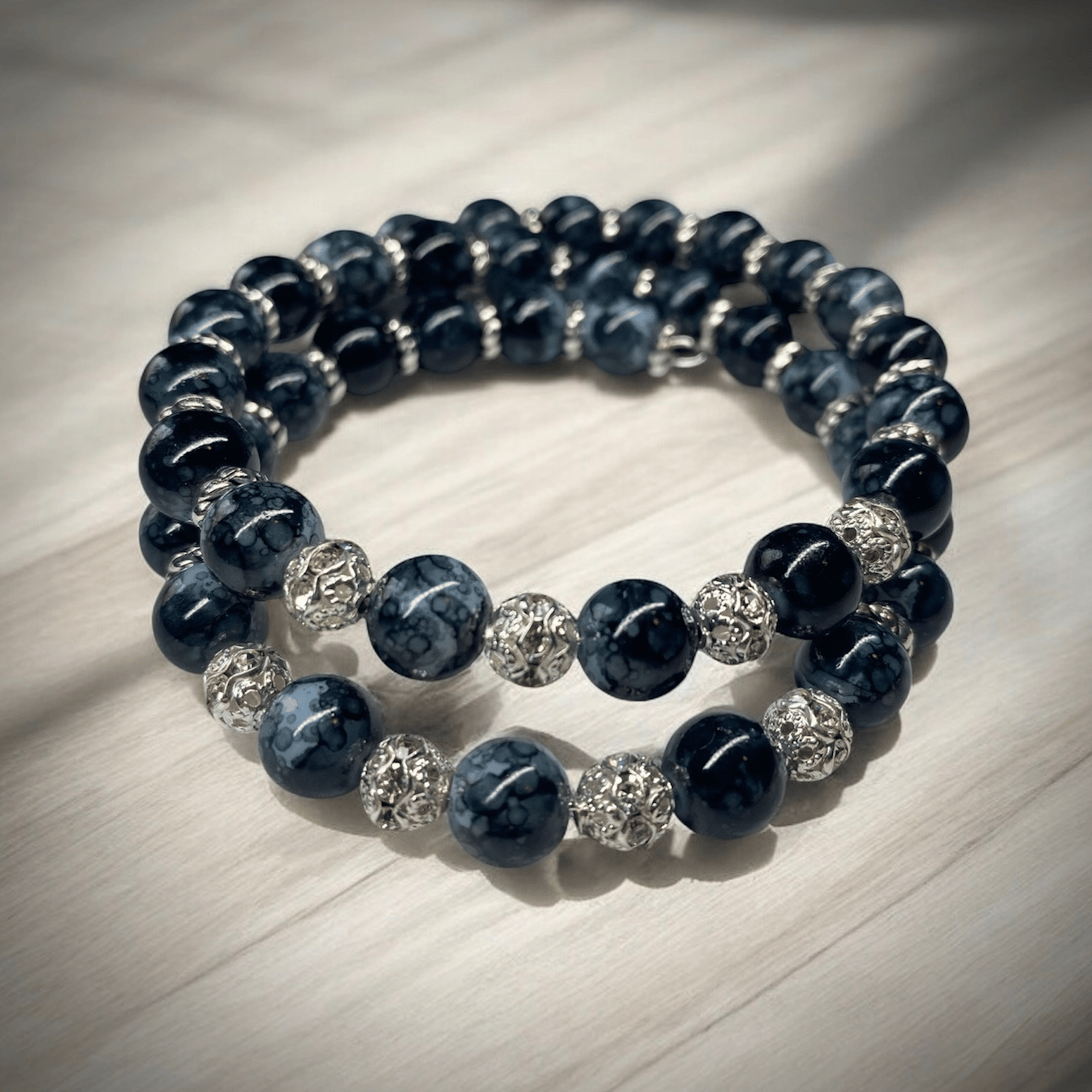 Beautiful 2 tier black, gray and silver beaded bracelet. Casual but with a bit of elegance.