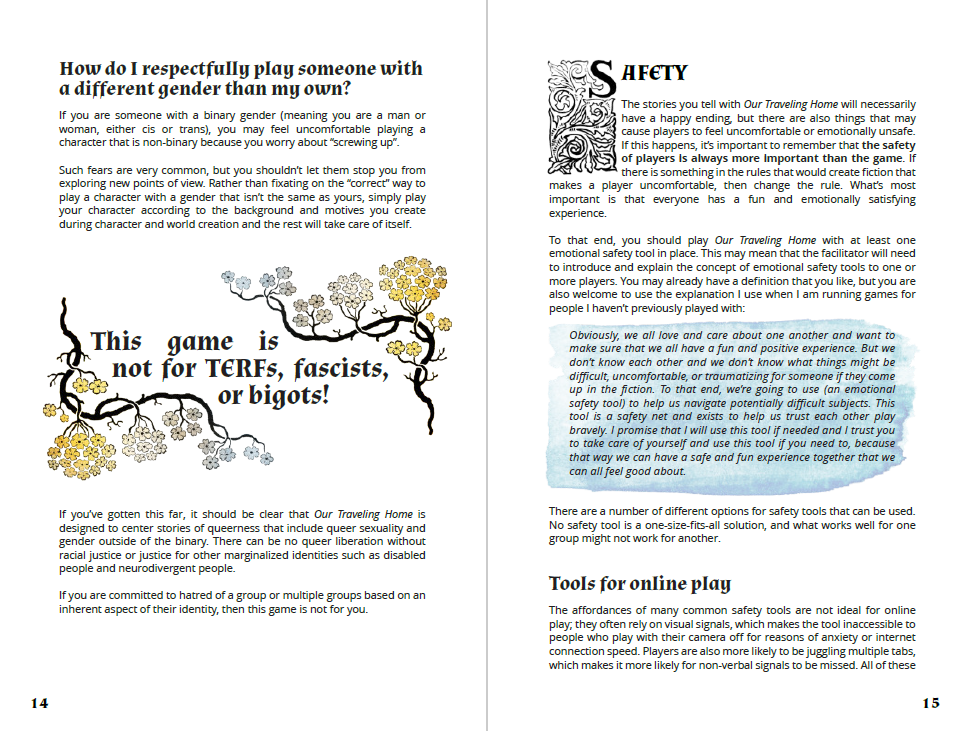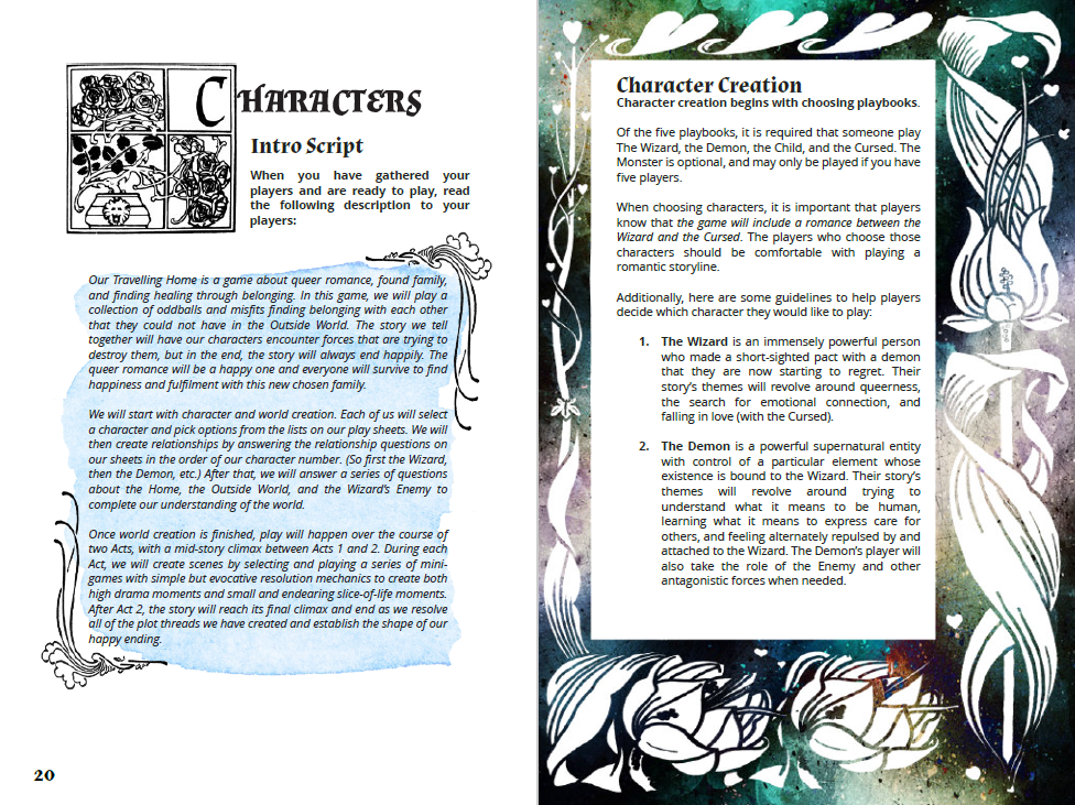 Our Traveling Home is a game about queer romance, found family, and finding healing through belonging, as inspired by the works of Studio Ghibli, and particularly Howl's Moving Castle. During play, you will tell stories about a collection of oddballs and misfits trying to make their new chosen family work in the face of opposition from the Outside World that is trying to tear them apart. But while the stakes are high, this game will always have a happy ending. The queer romance will resolve happily, and everyone in the family will get to have a happily ever after.