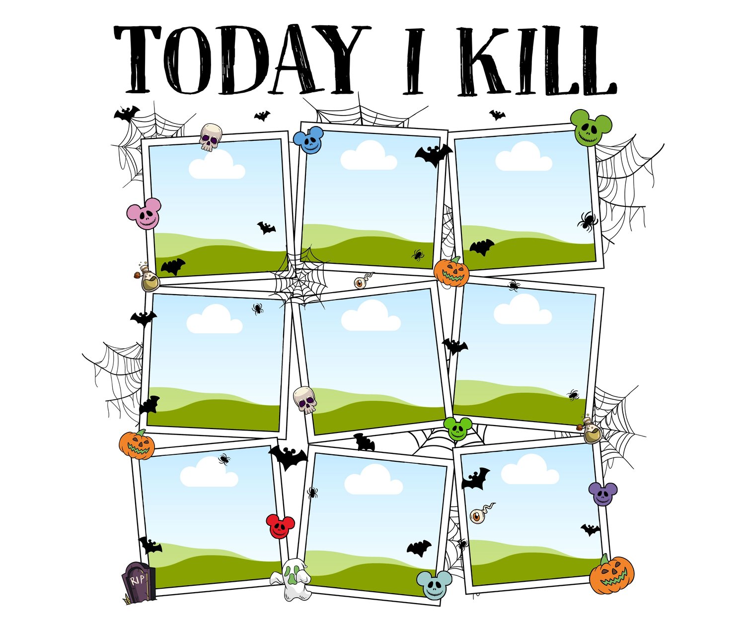 This unique design features a grid of nine Polaroid-style photo frames, perfect for showcasing your favorite Halloween costumes, spooky moments, or character fan art. The bold, edgy "TODAY I KILL" title is complemented by a creepy-cute array of Halloween elements: cobwebs, bats, spiders, pumpkins, skulls, ghosts, RIP tombstones, and playful character-inspired mouse ear motifs in various spooky colors.