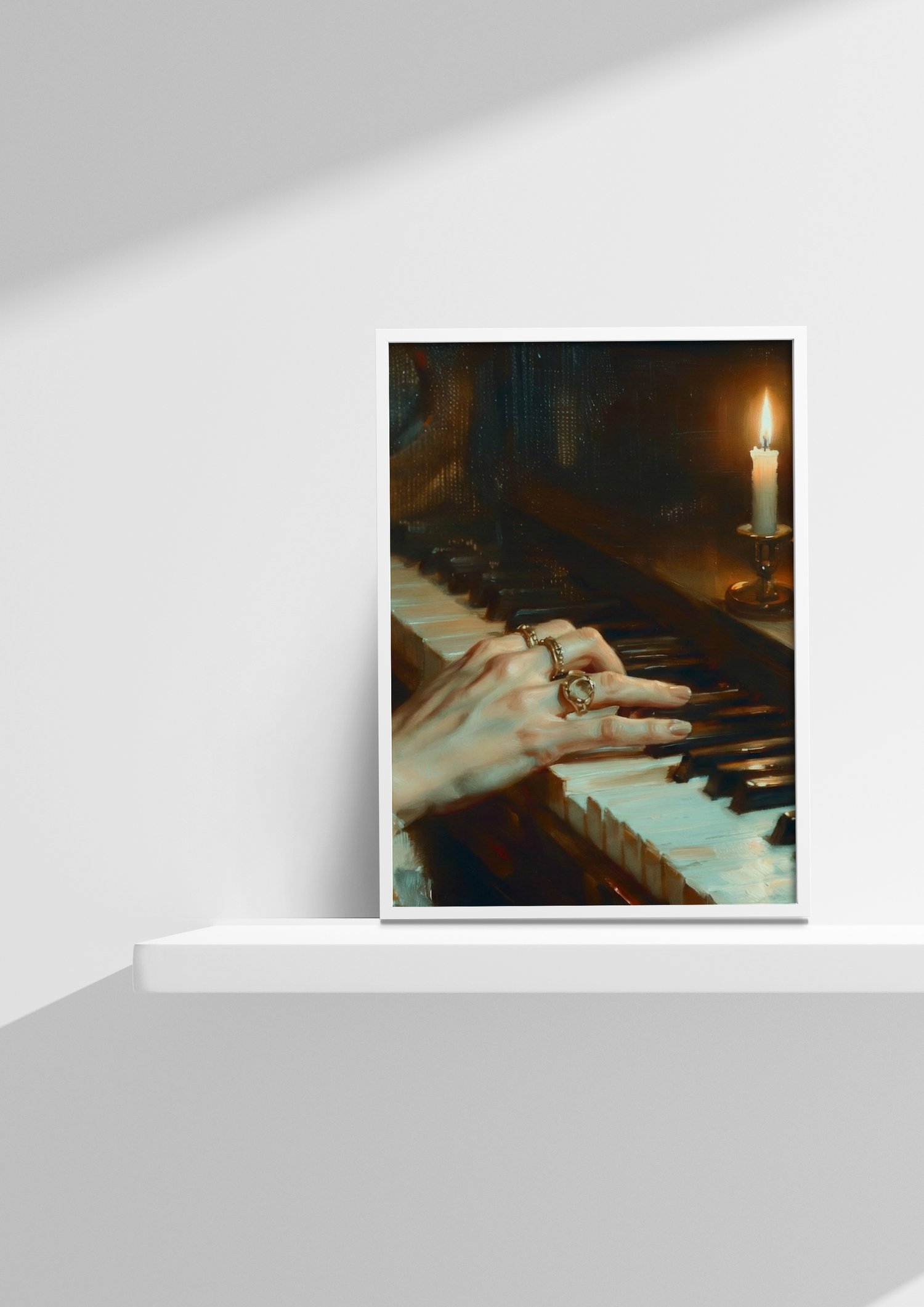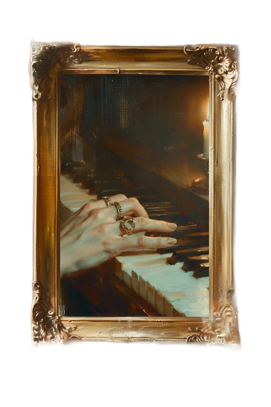 Rendered in warm, oil-like strokes, a ringed hand drifts across aged piano keys, illuminated by a solitary candle. The scene feels suspended in time — a private moment of music, devotion, and loss, as if the room itself is fading even as the melody lingers.