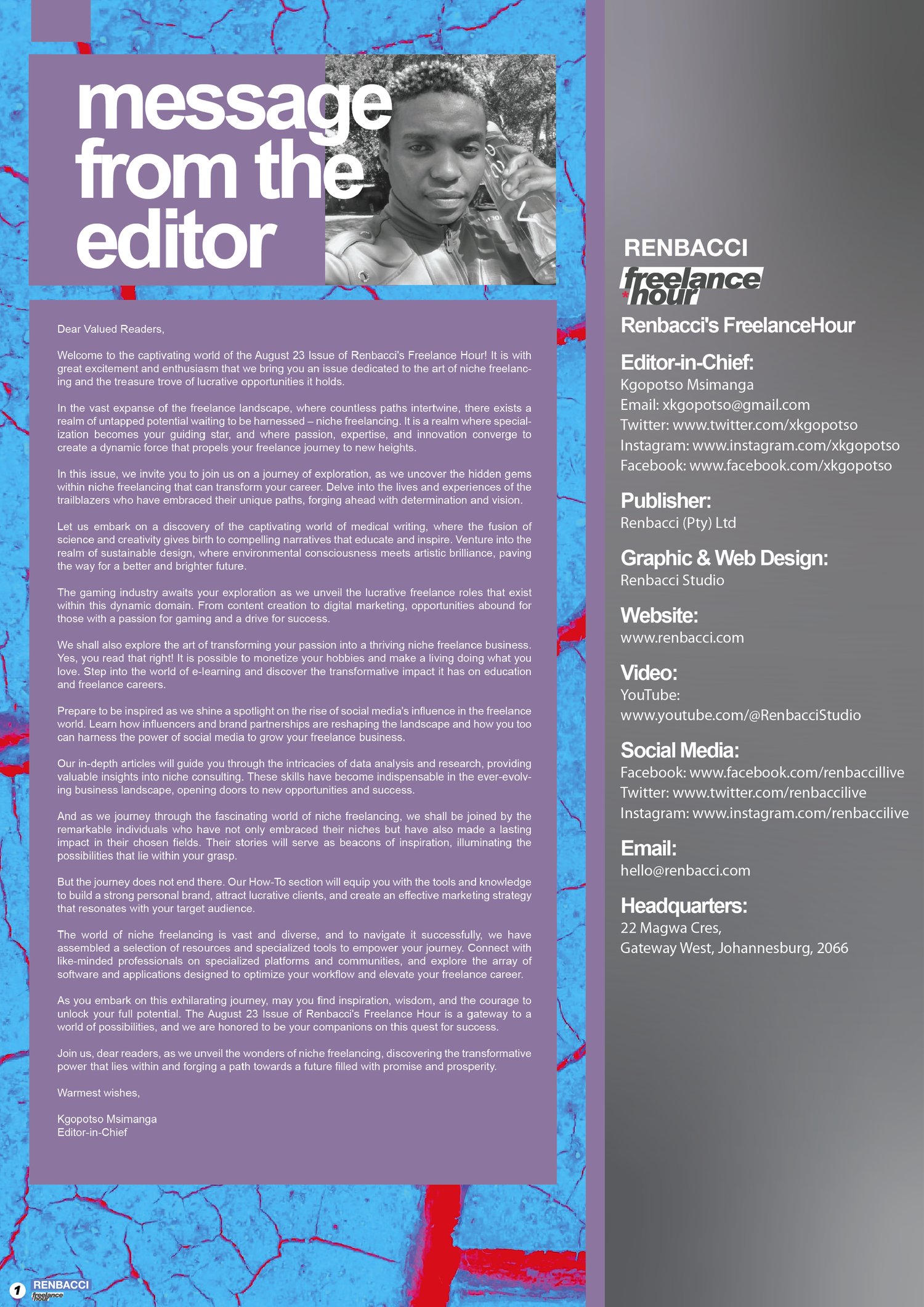Join us as we unveil a world where passion meets profession, and ideas transform into realities. Whether you're just starting your freelance journey or you're a seasoned pro, our magazine is your partner in growth, creativity, and entrepreneurship. Get ready to be inspired, informed, and equipped to elevate your freelance game. Welcome to a community that's all about you—your aspirations, your challenges, and your success. It's time to embark on this journey together. Welcome to Renbacci's FreelanceHour.