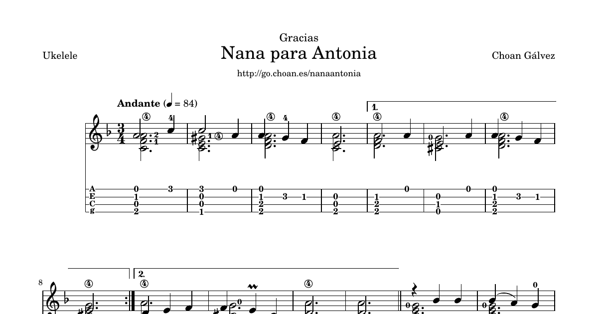 Partitura (notación musical y tablatura) de Nana para Antonia, una composición de Choan Gálvez para ukelele solo.