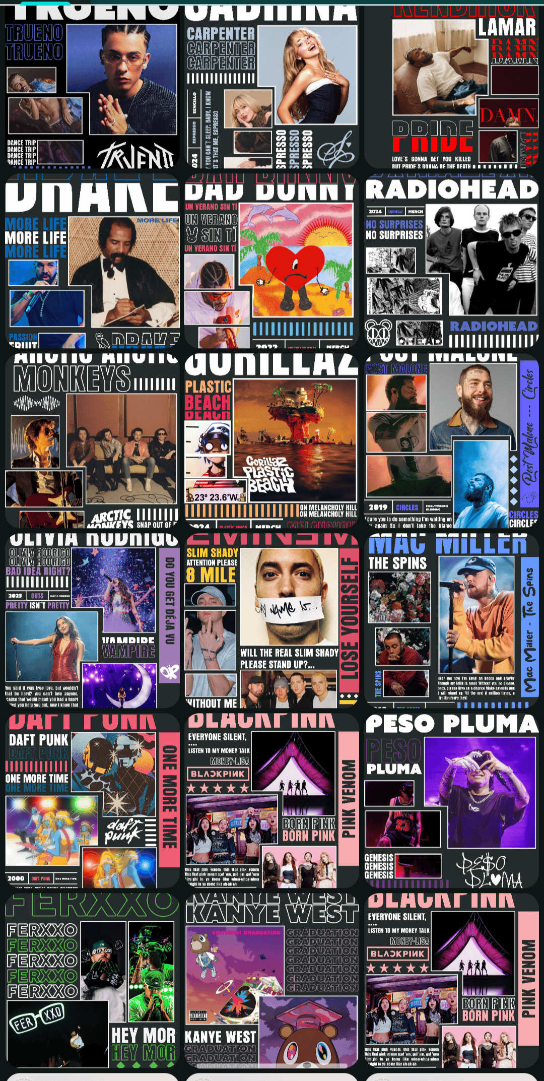 Trueno , Sabrina Carpenter, Kendrick Lamar, Drake , Bad Bunny, Radiohead, Gorillaz , artic monkeys, Paramore, post Malone, Olivia Rodrigo, Black pink, eminem, Daft punk, Mac Miller.