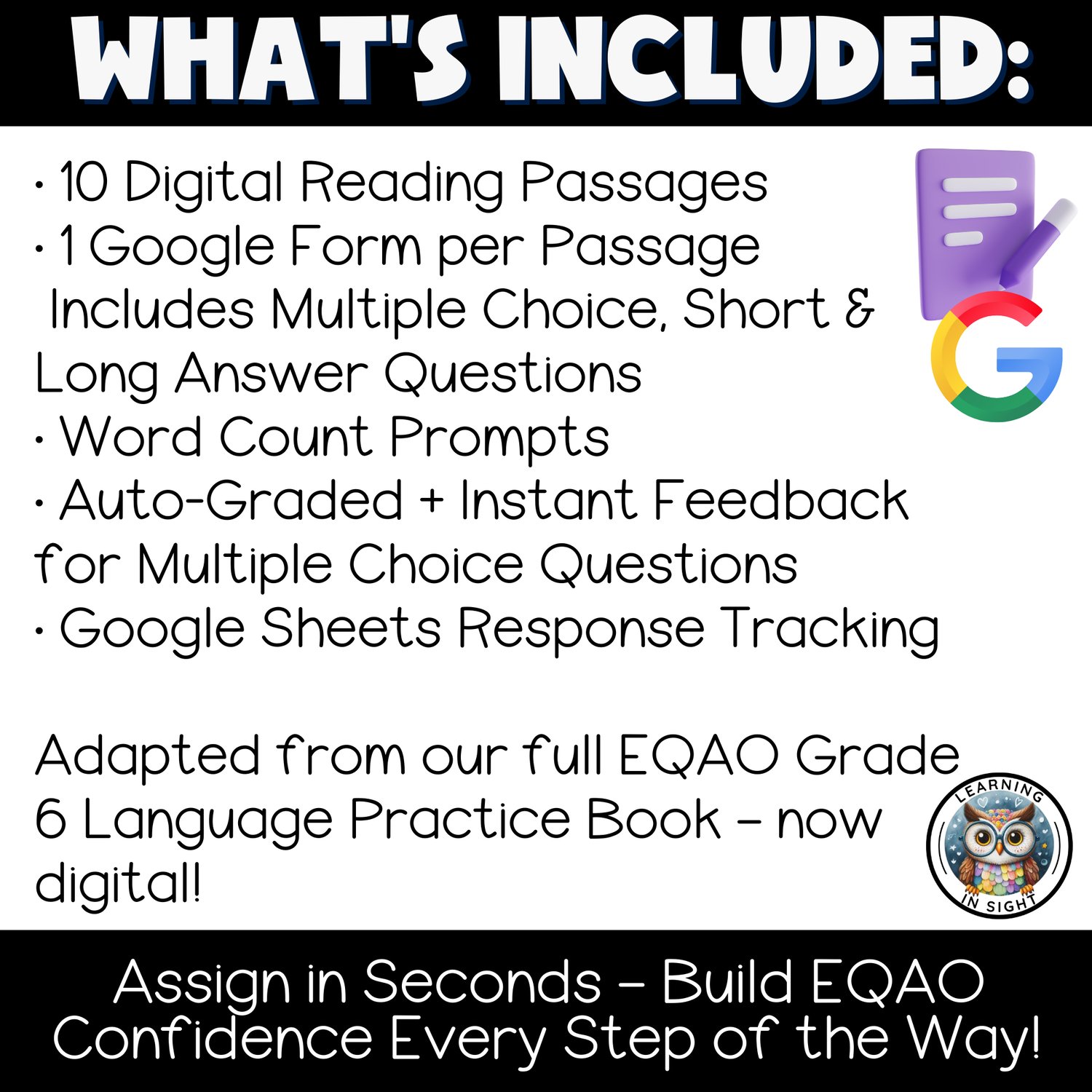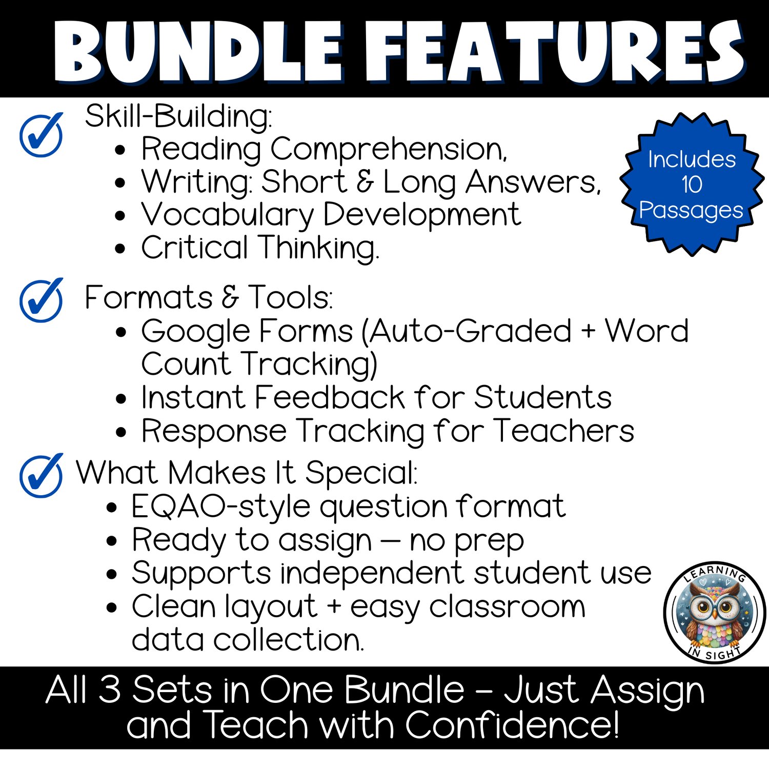 Give your students authentic, ready-to-use EQAO language practice with this complete Google Forms bundle. Each set includes original EQAO-style reading passages paired with comprehension questions, short answer prompts, and thought-provoking long-answer writing tasks, perfect for building confidence and test readiness.