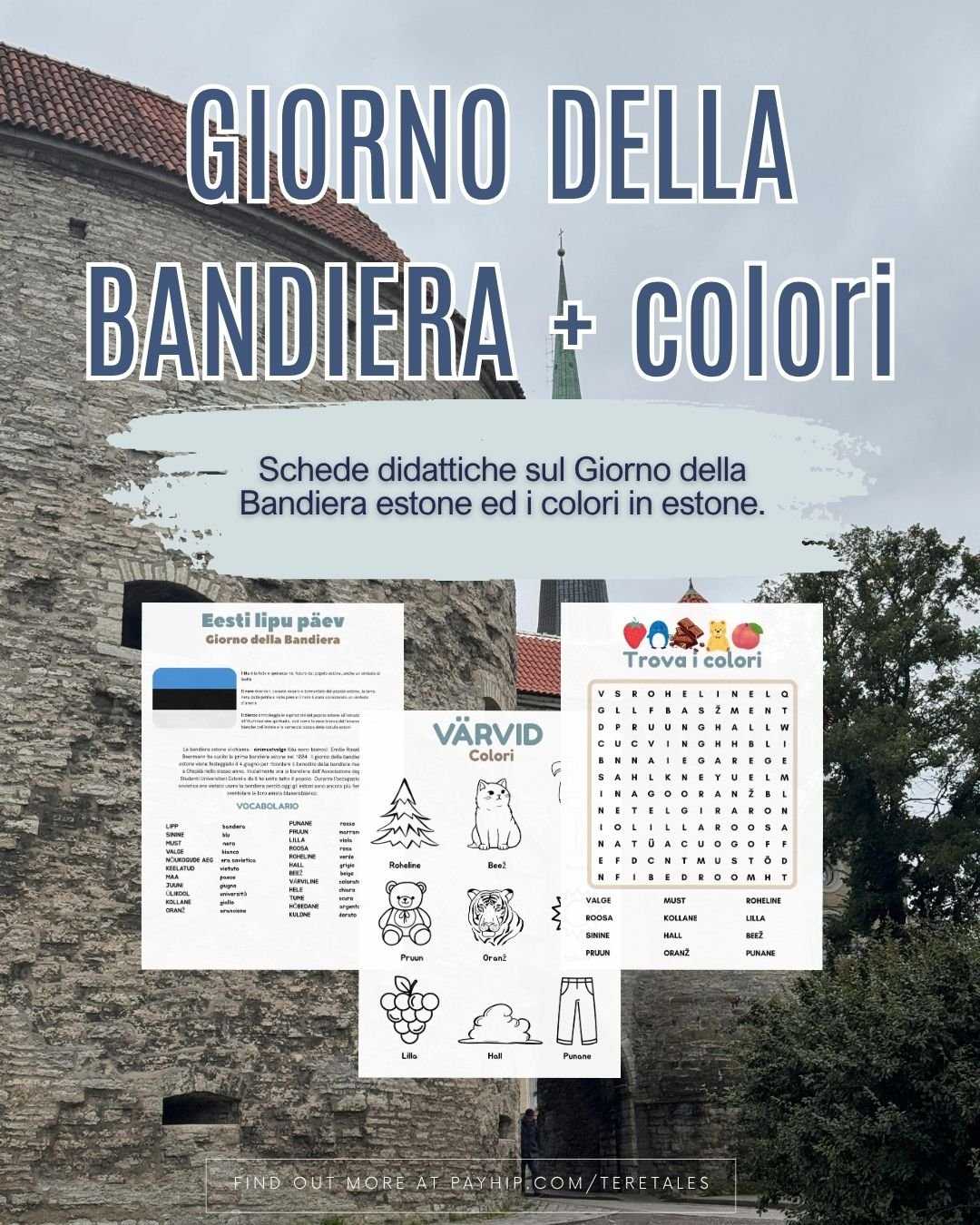 Schede didattiche sul Giorno della Bandiera estone ed i colori in estone. Adatto per i bambini. Impara la cultura e lingua estone. Include: storia del Giorno della Bandiera, spiegazione colori della bandiera estone, lista dei colori in estone, esercizio con colori, gioco di cercare le parole.