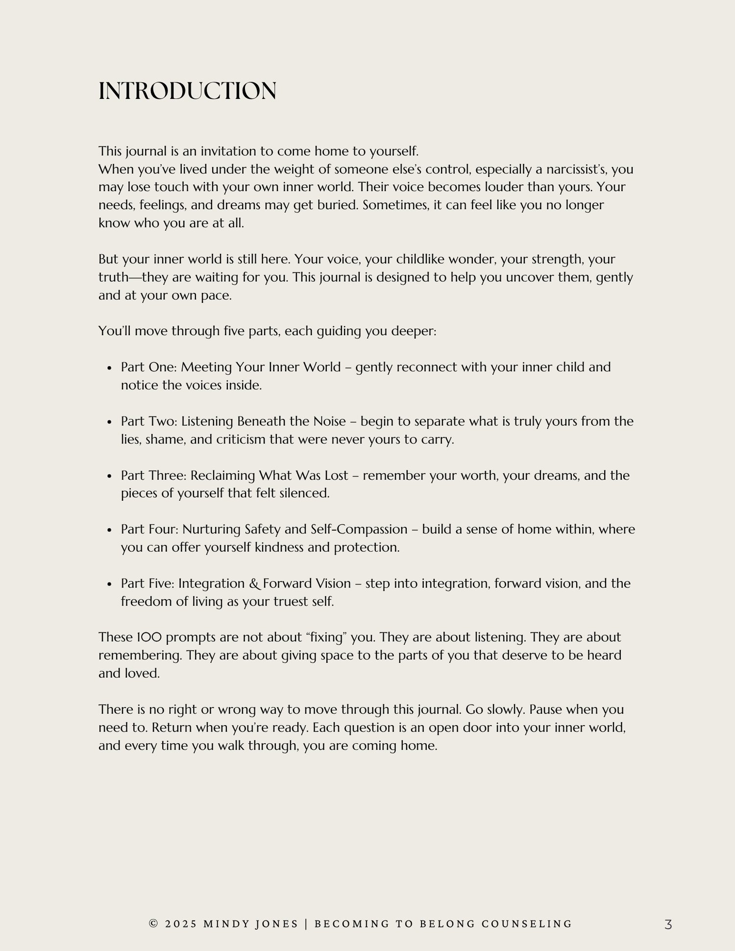 Through the following five transformative parts, you’ll rediscover your voice, rebuild inner safety, and remember that you were never broken: