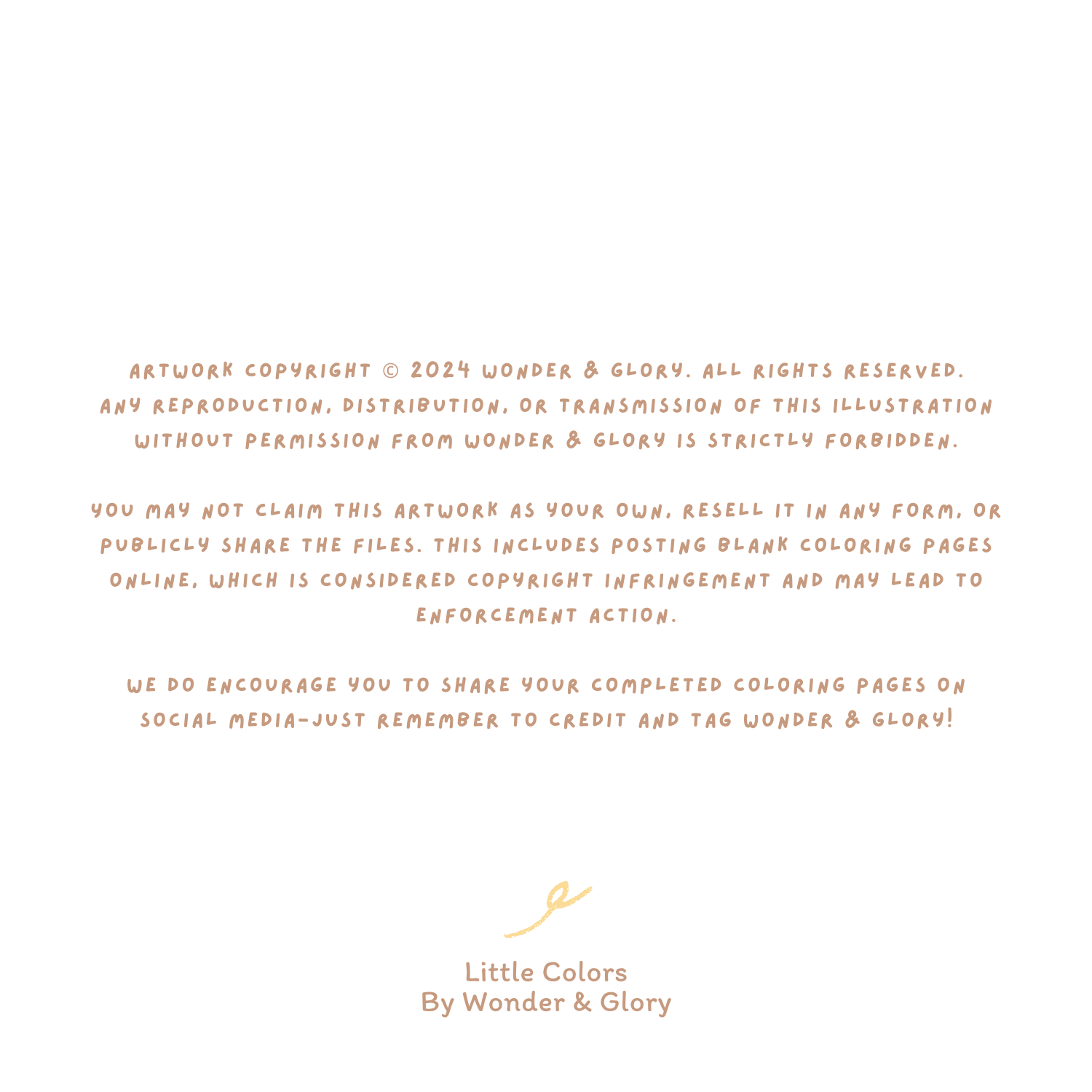 - Reselling or re-posting coloring pages is not allowed. If you share your completed coloring pages on social media, make sure to credit and tag Wonder & Glory. *Only colored pages may be posted!
