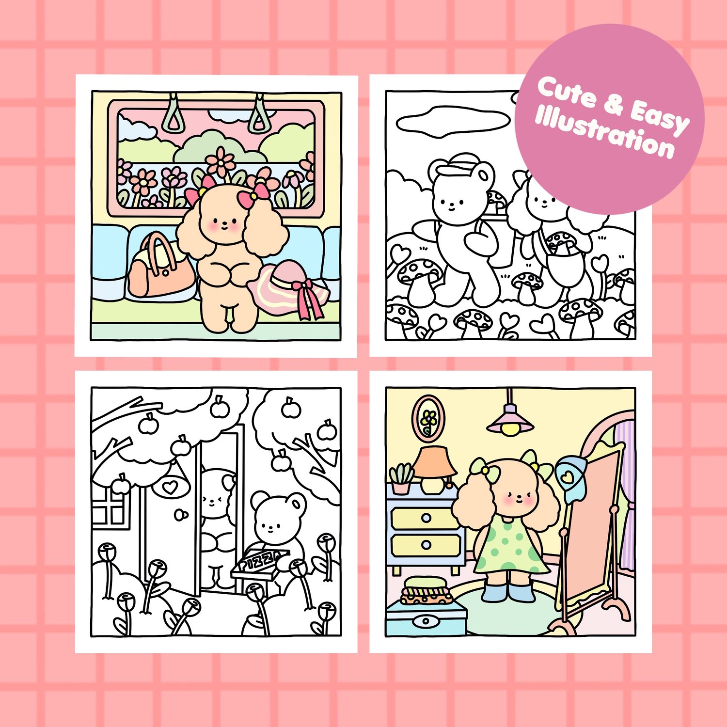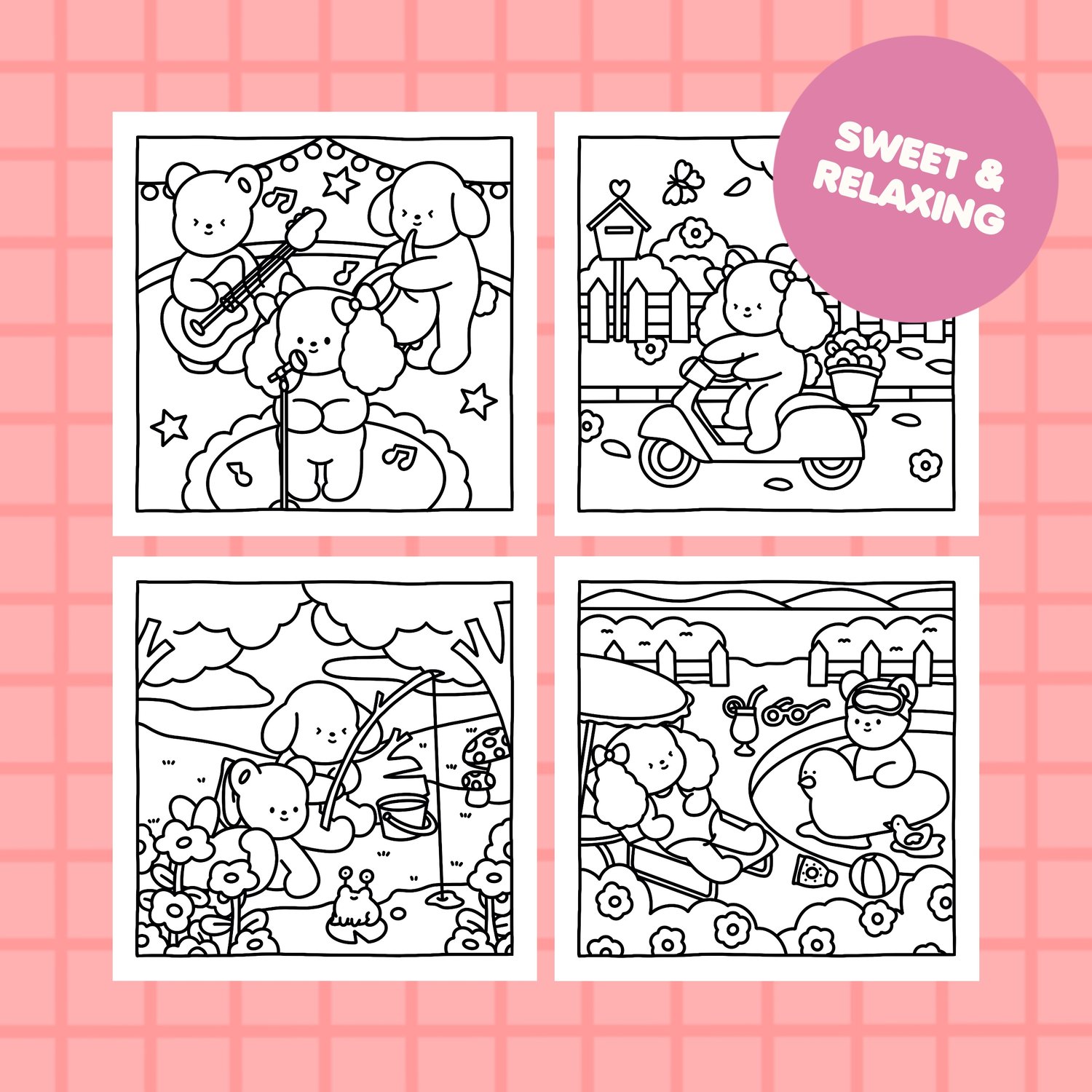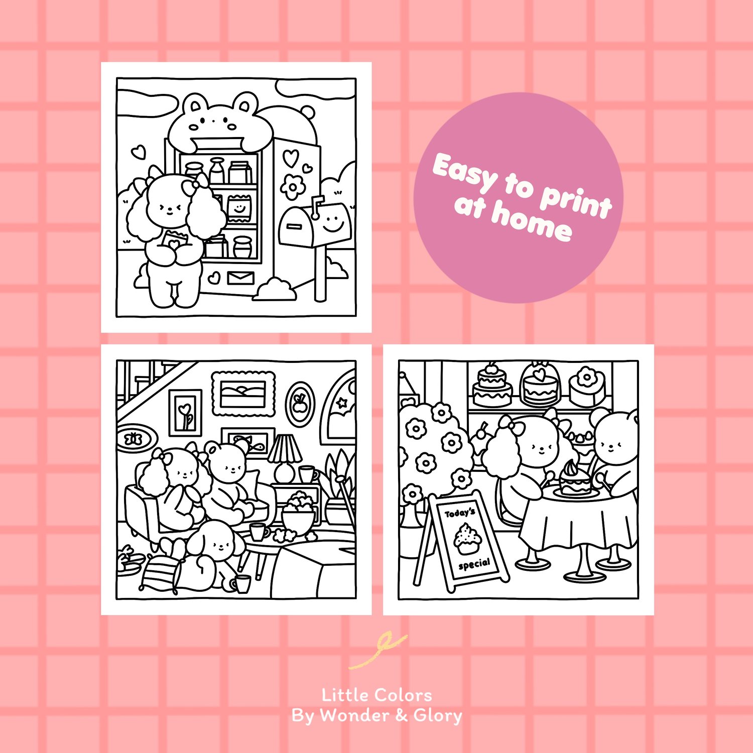 Enter the charming world of the Comfy Days Coloring Book, where 44 adorable pictures of animals like puppies and bears are waiting for you. Color heartwarming scenes in bakeries, cafes, gardens, and market fairs. These cute designs are perfect for a relaxing and fun coloring experience!