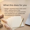 - Start tracking your budget, guests, vendors, payments, and timeline