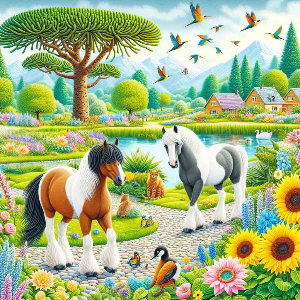 Beautiful horses beside a lake with ducks. There are trees, flowers & shrubs.