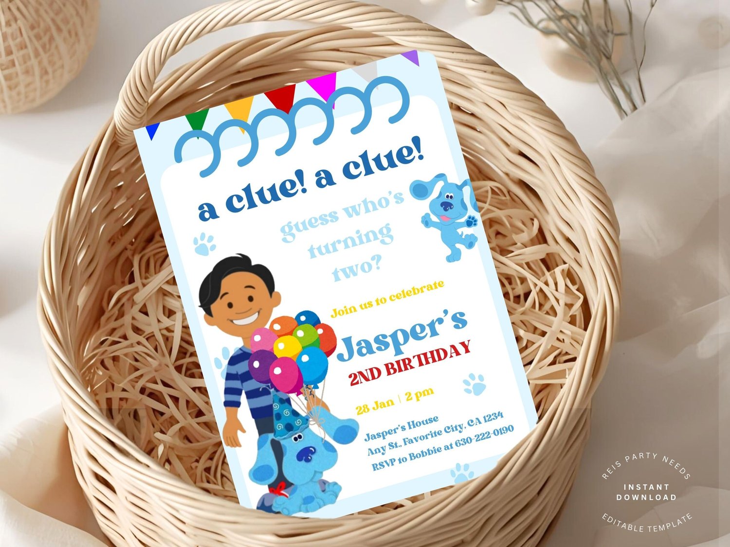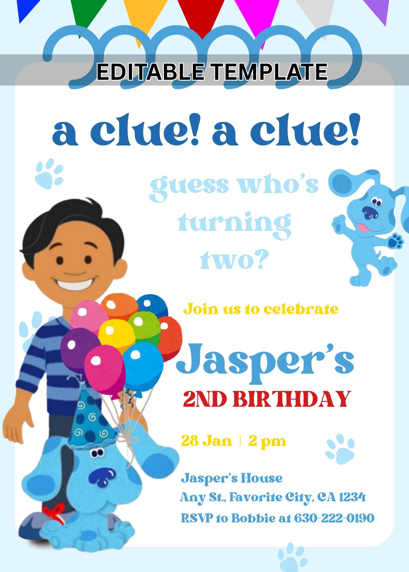 Looking for the perfect Blue’s Clues inspired birthday invitation for your toddler? This adorable and colorful editable template is perfect for a 2nd birthday boy celebration!