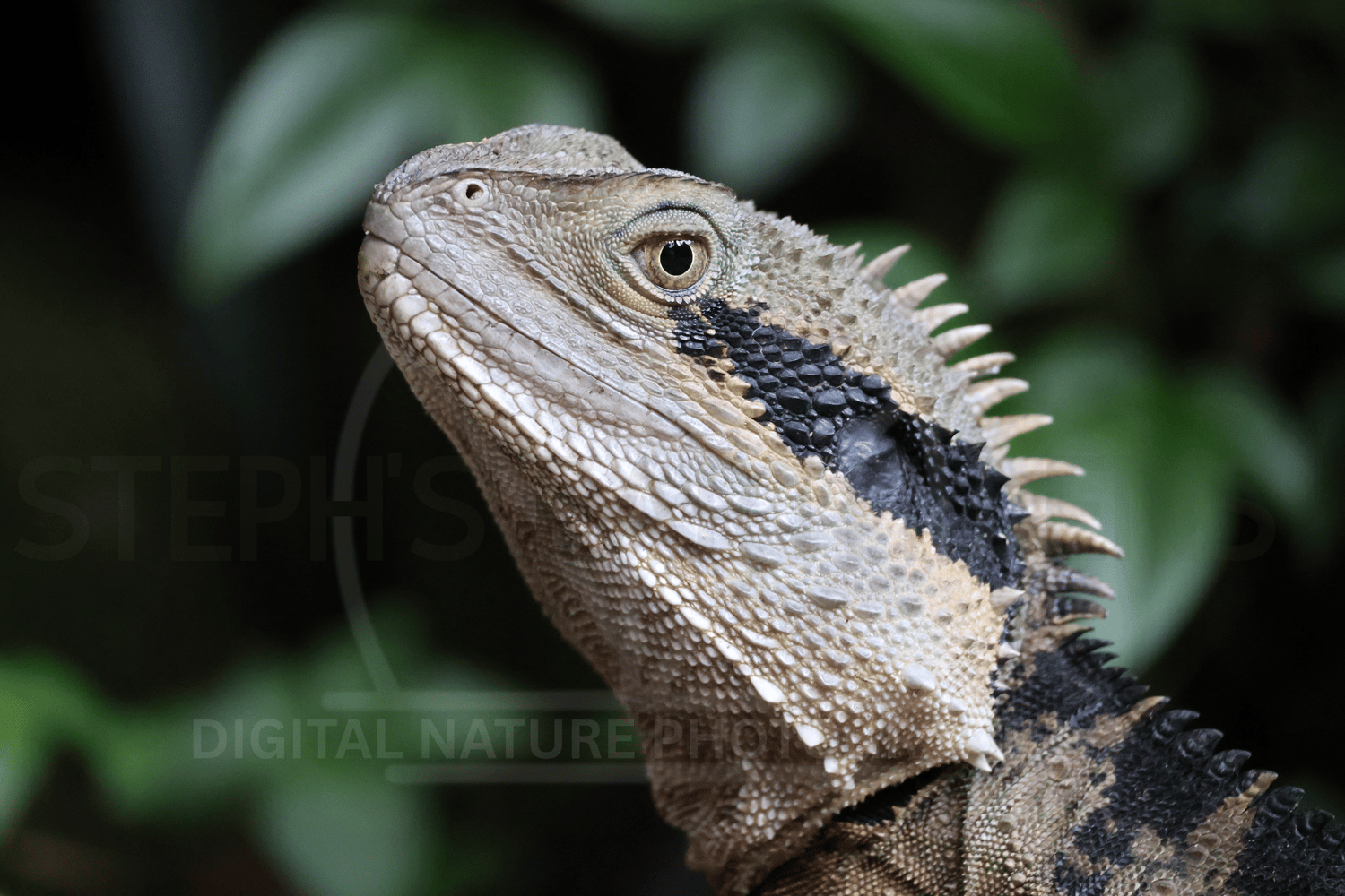 A close-up portrait of an Australian water dragon captured in a moment of perfect poise. With his head held high and eyes fixed on the lens, he exudes confidence like he knows he’s the star of the shot. This lizard’s detailed scales and intense gaze give him a presence that’s both powerful and charismatic.