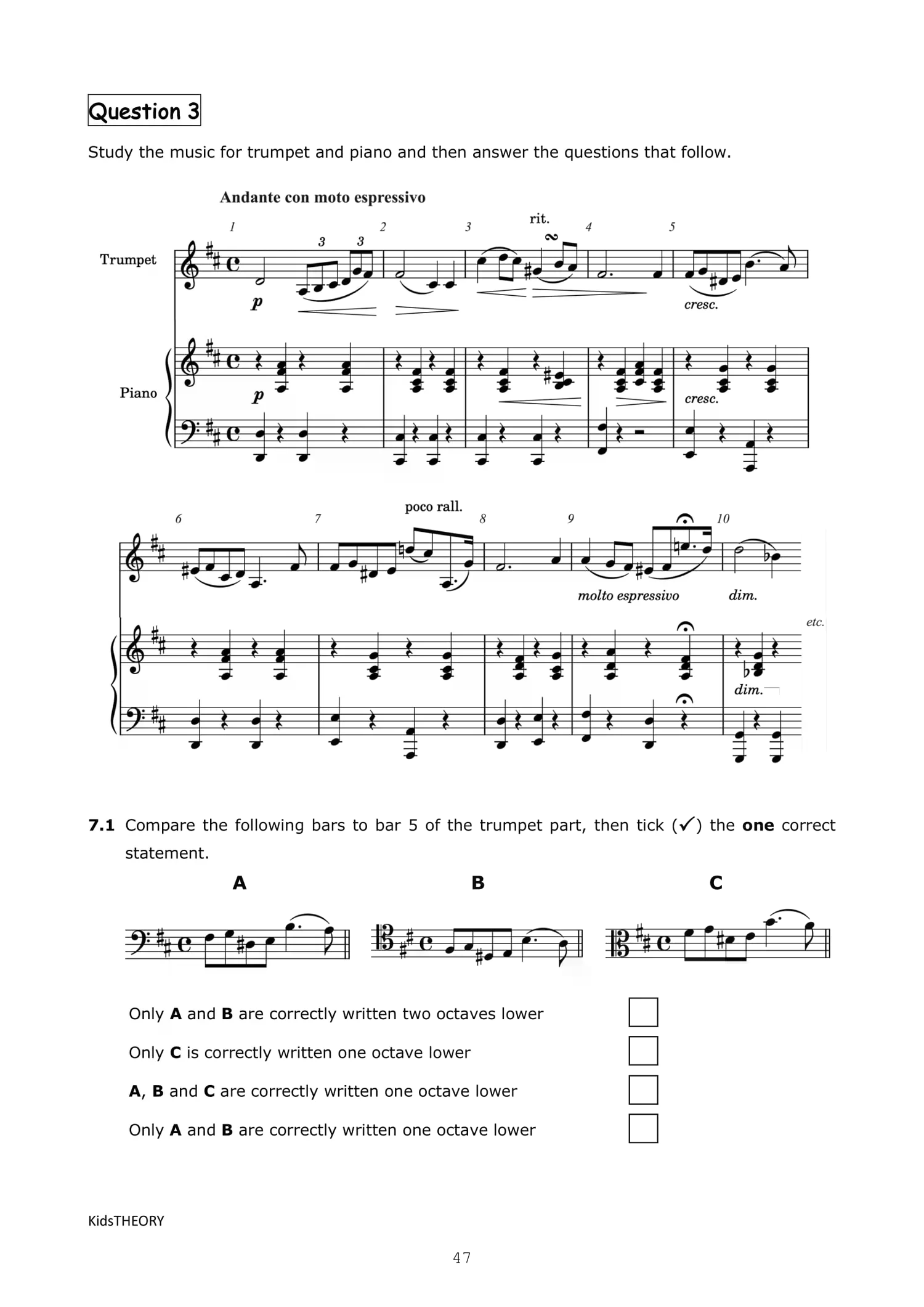 本考題練習,依照考試模式設計,共涵蓋七大題型,每題的每個部分均配有三十條練習及答案,讓學生集中操練,熟悉各類題目形式,迅速掌握重點概念。Official ABRSM practice papers 則建議留待最後階段作最終衝刺之用。