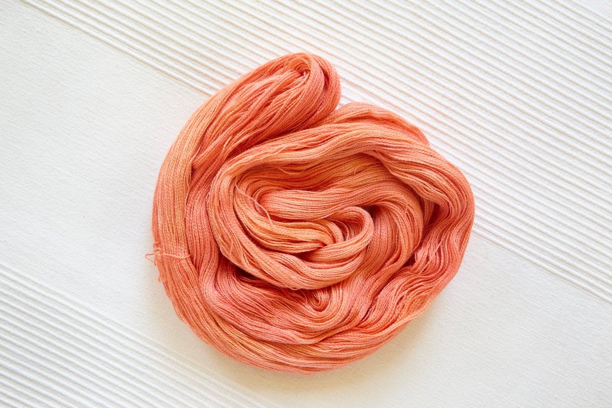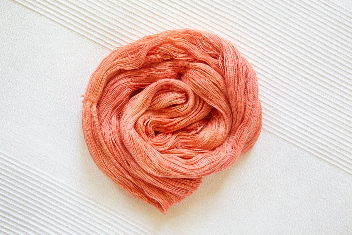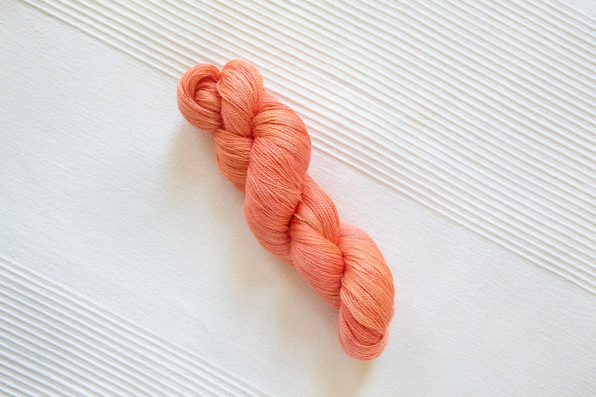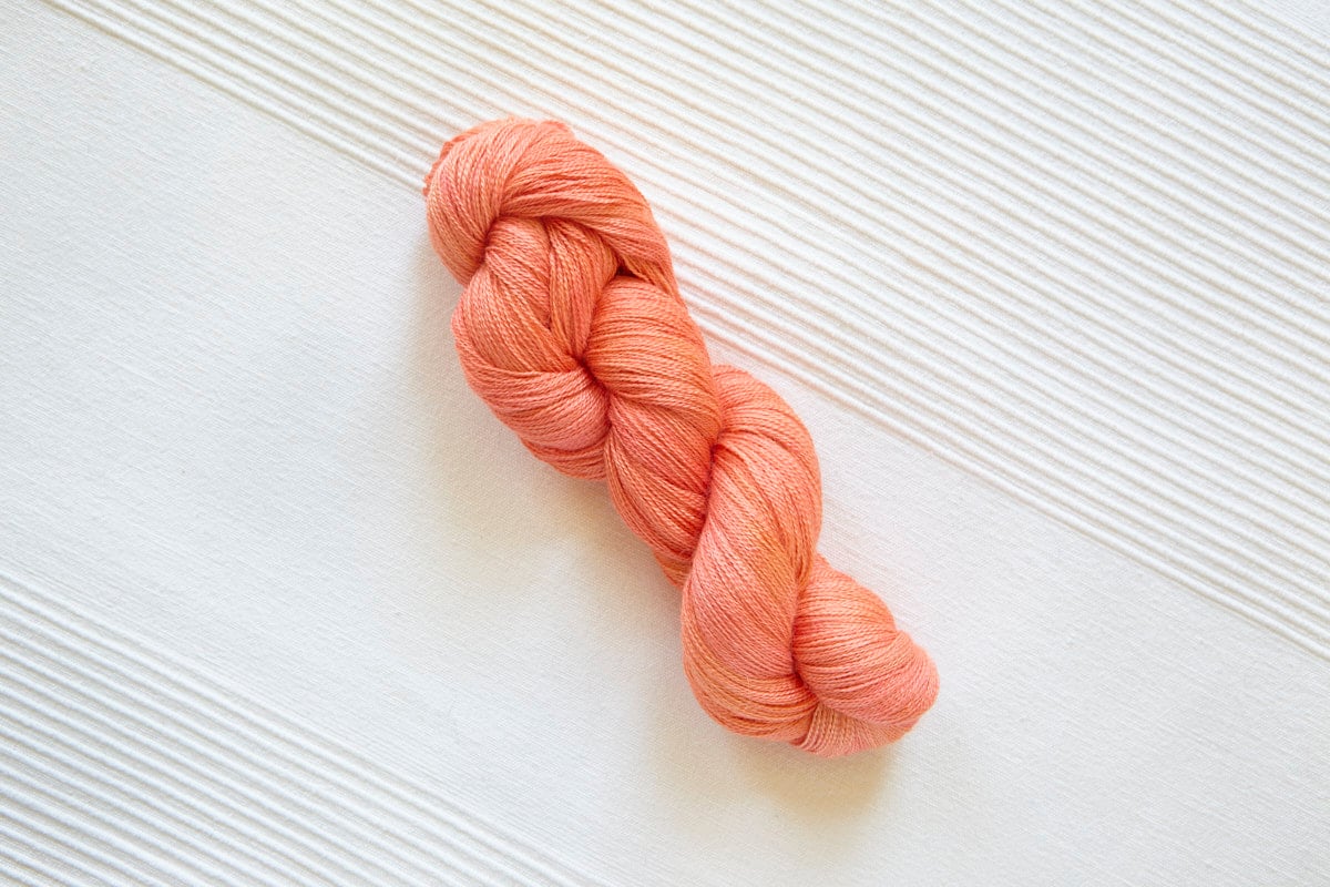 Whisper (Lace) in colorway: Peach Dream. Tonal variegated. Medium to light peach with tonal variations from rosy peach to more orange peach. Ooak