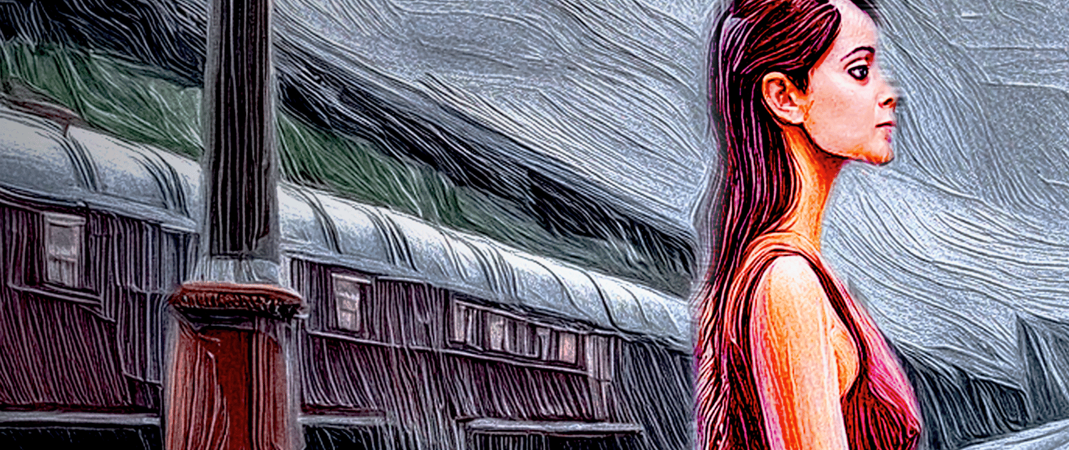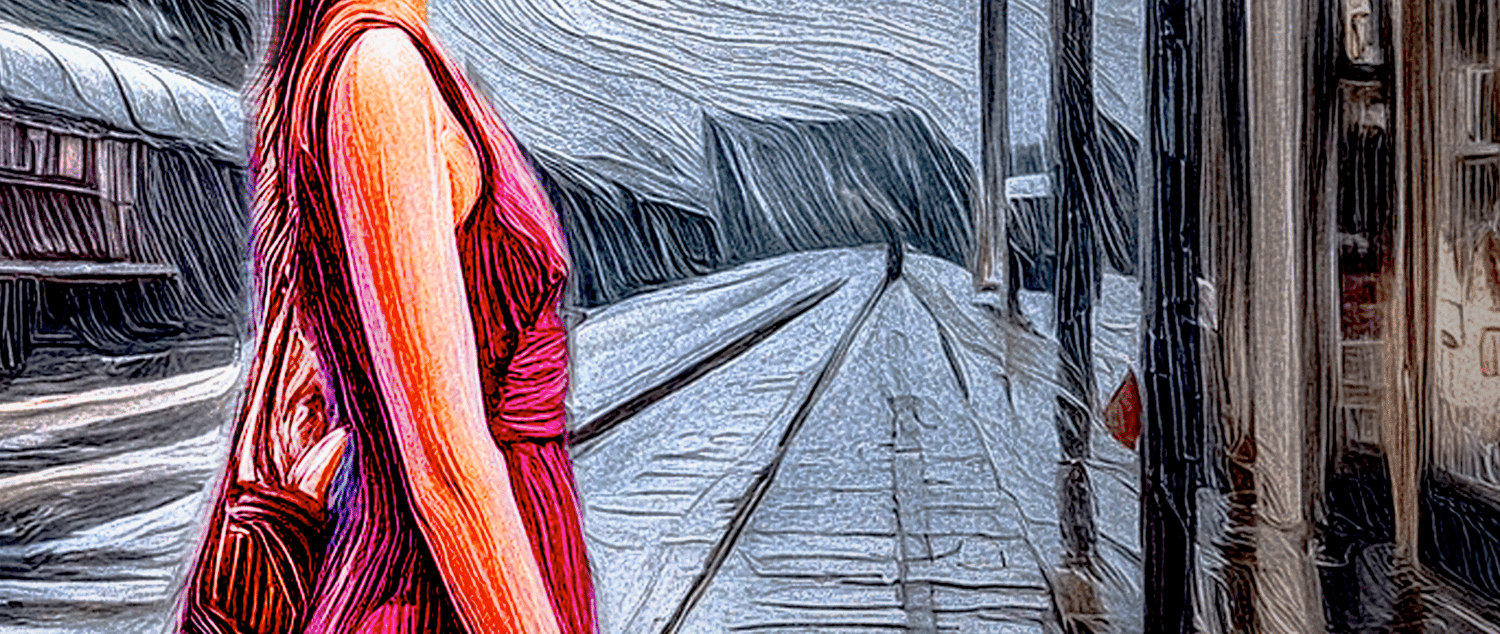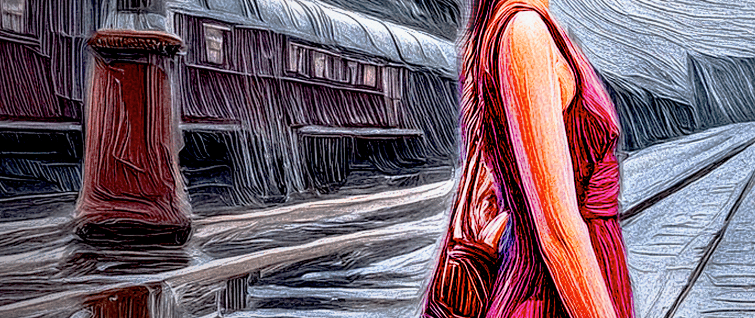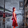 The artwork masterfully blends AI-generated elements with the artist's own modifications, creating a rich and immersive tableau. The attention to detail, from the weathered station facade to the wistful expression on Patricia's face, invites the viewer to linger and explore the layers of nostalgia and memory woven into the composition.