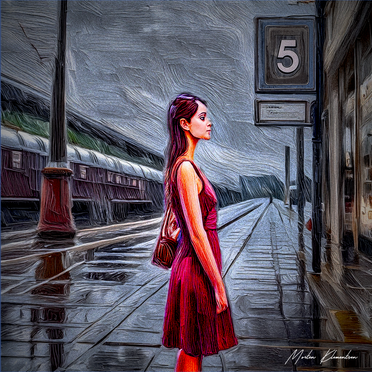 "TRAIN STATION No. 5" by Morten Klementsen is a captivating digital artwork that transports the viewer to a bygone era. The scene depicts a now-defunct train station in Scotland, where the gray-haired lady Patricia would wait for her daily commute, often passing the time by gazing into the windows of the local shop.