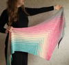 Vaski soi is a slightly asymmetric triangular shawl. It is worked in the shape of an arrow from one corner to the long edge on the opposite side. The four colors of the shawl are meant to have a good contrast, but the shawl will also look great with colors close to each other fading from one shade to another. The Finnish phrase vaski soi means that a brass instrument is being played.