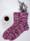 The socks have a simple toe-up and in-the-round construction that starts at the tip of the toe using Judy’s Magic Cast-On to create rounded toes and feature short row heels. The pattern is written to be worked using Magic Loop method: the top of the foot is worked across the first needle and the sole of the foot is worked across the second needle. If preferred, DPNs can be used instead: work instructions for instep across first and second DPNs, work sole stitches across third and fourth DPNs.