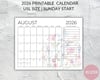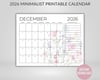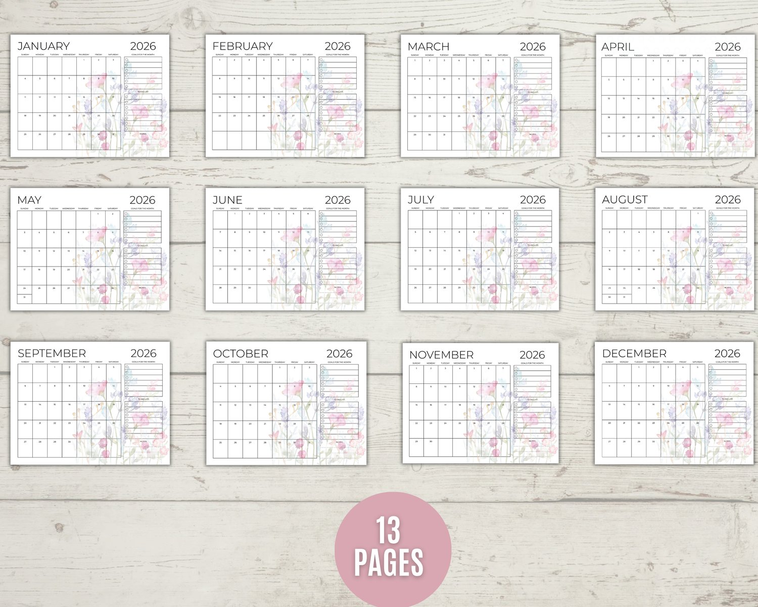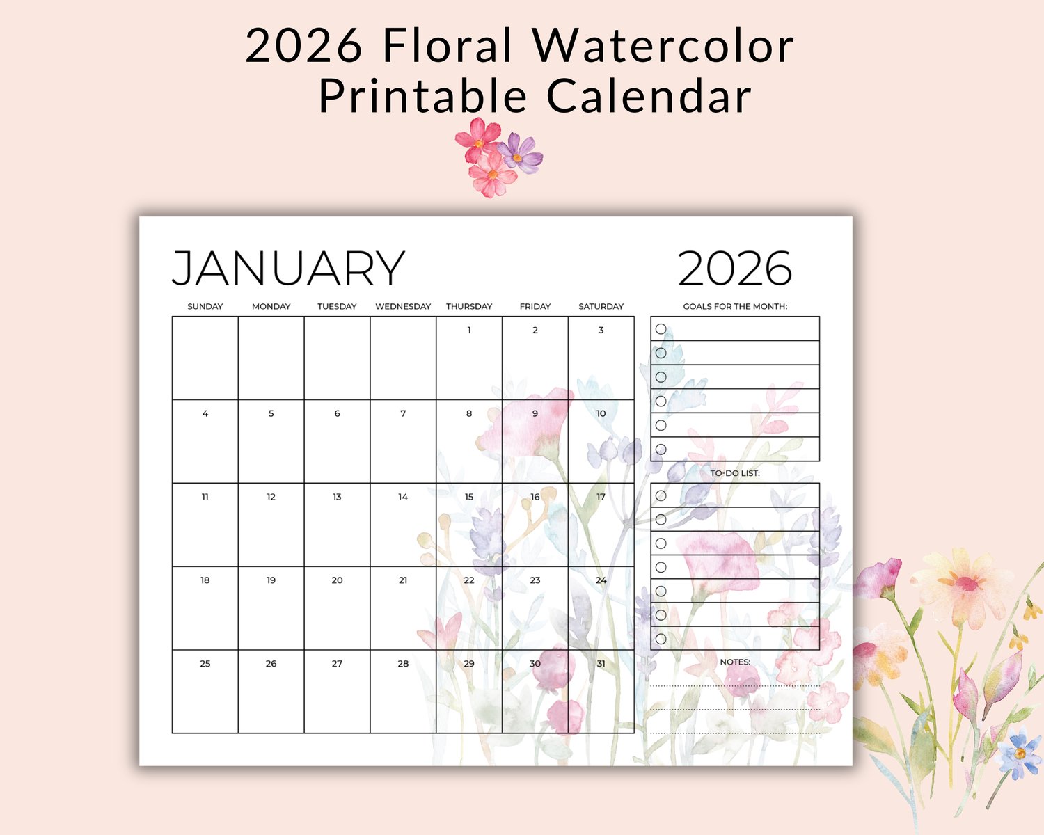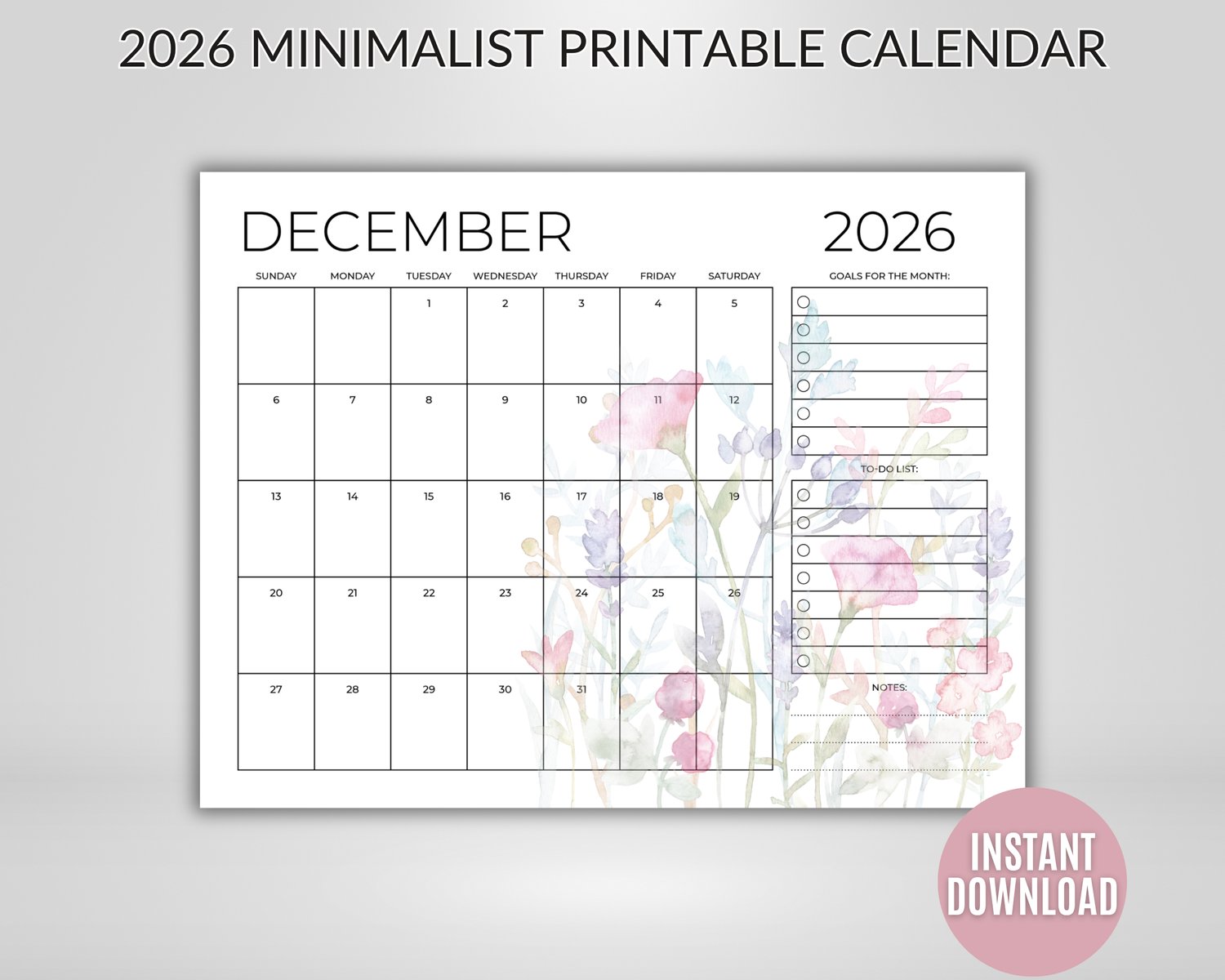 2026 Flora Watercolor Minimalist Calendar, Printable Landscape Horizontal
