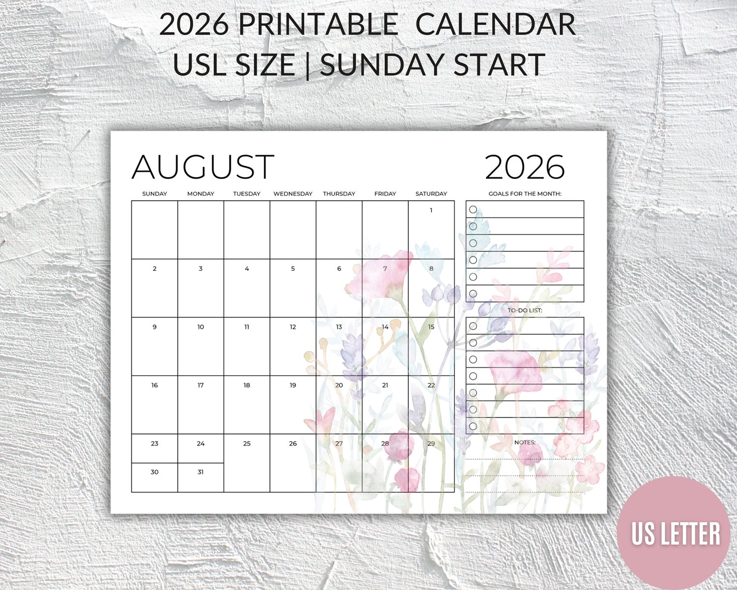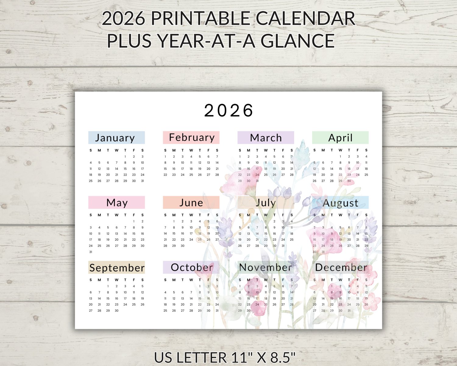 Do you want a 2026 calendar to stay organized while also having something elegant to hang on your wall or use on your desk? This Printable 2026 Floral Calendar in soft Watercolors is Plain and Classic, allowing you to add all your important dates and stay organized throughout the year. It comes in US Letter Size and includes a 2026 Year-at-a-Glance Calendar.