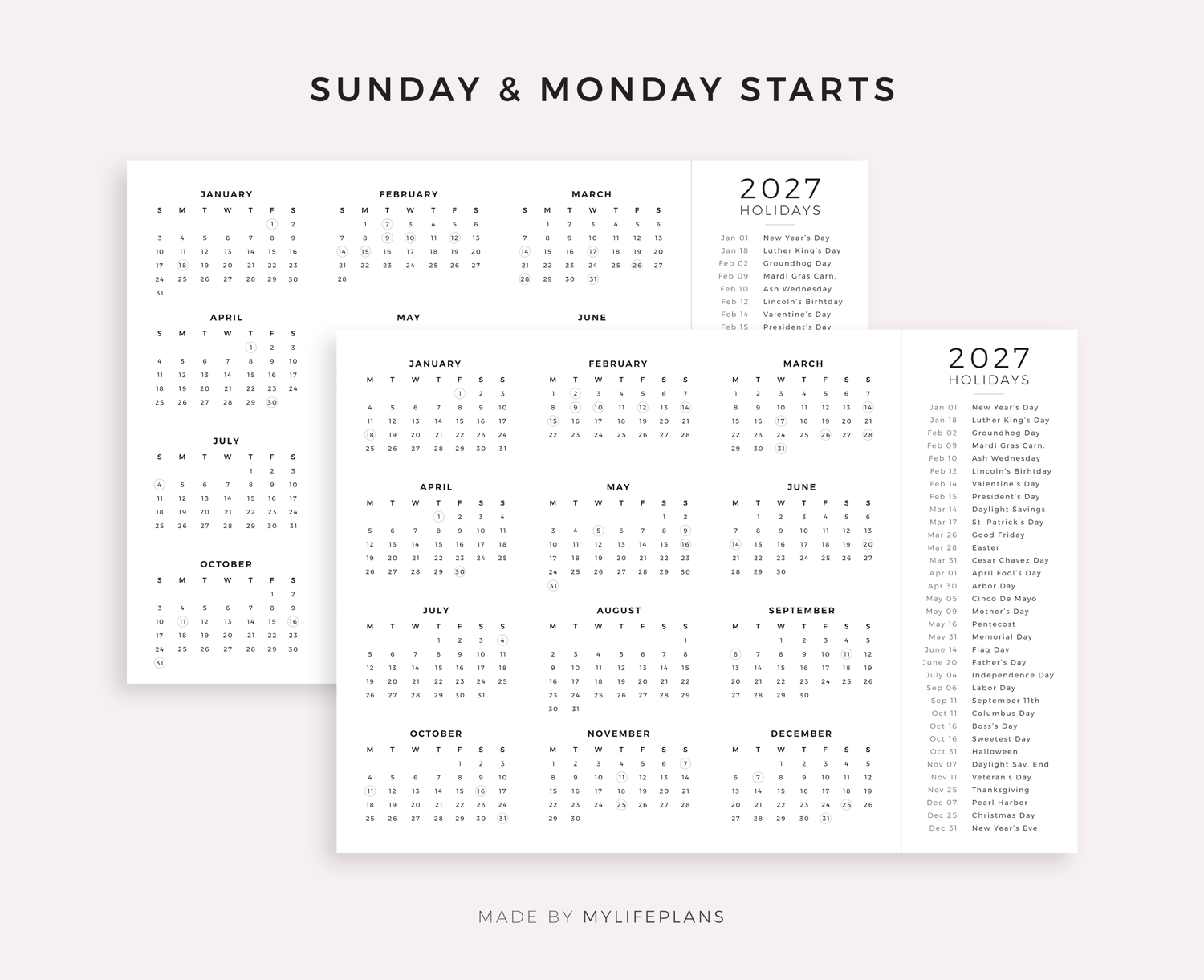 2027 Year Calendar with Holidays on One Page, Printable, Landscape, A4/Letter Size