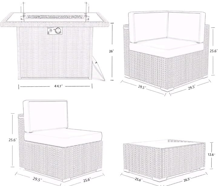 44" Professional Fire Pit Table: The 55,000 BTU propane fire table serves as a stunning centerpiece. It features a side-access door for a standard propane tank and a tempered glass wind guard for safety and style.